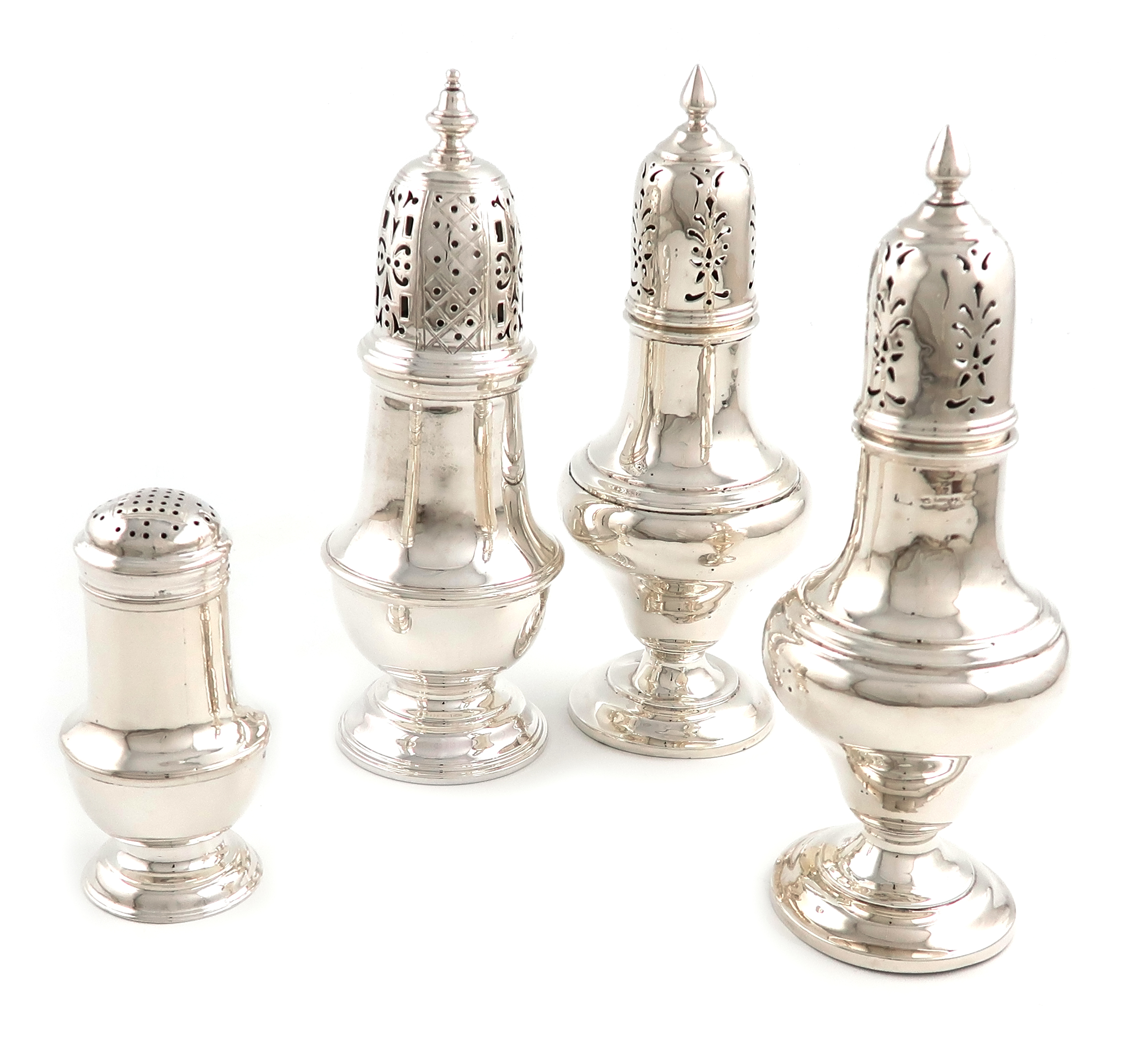 comprising: a George II bun caster, by Samuel Wood, London 1749, plus a pair of sugar casters, Birmingham 1925, and another caster, London 1932, approx. weight 16.5oz. (4)