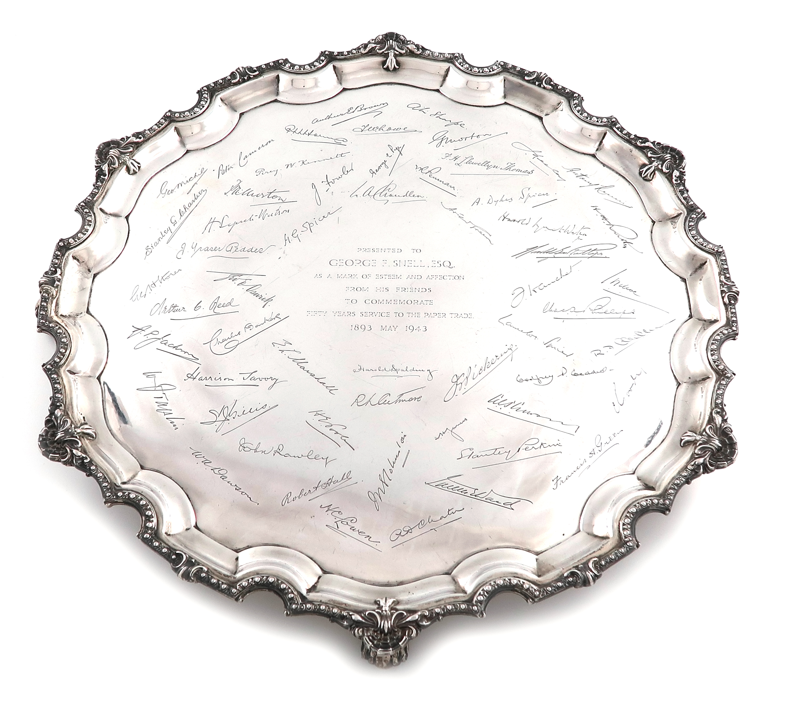 circular form, beaded and shell border, the centre with a presentation inscription and facsimile signatures, on four knurl feet, diameter 30.5cm, approx. weight 64oz.