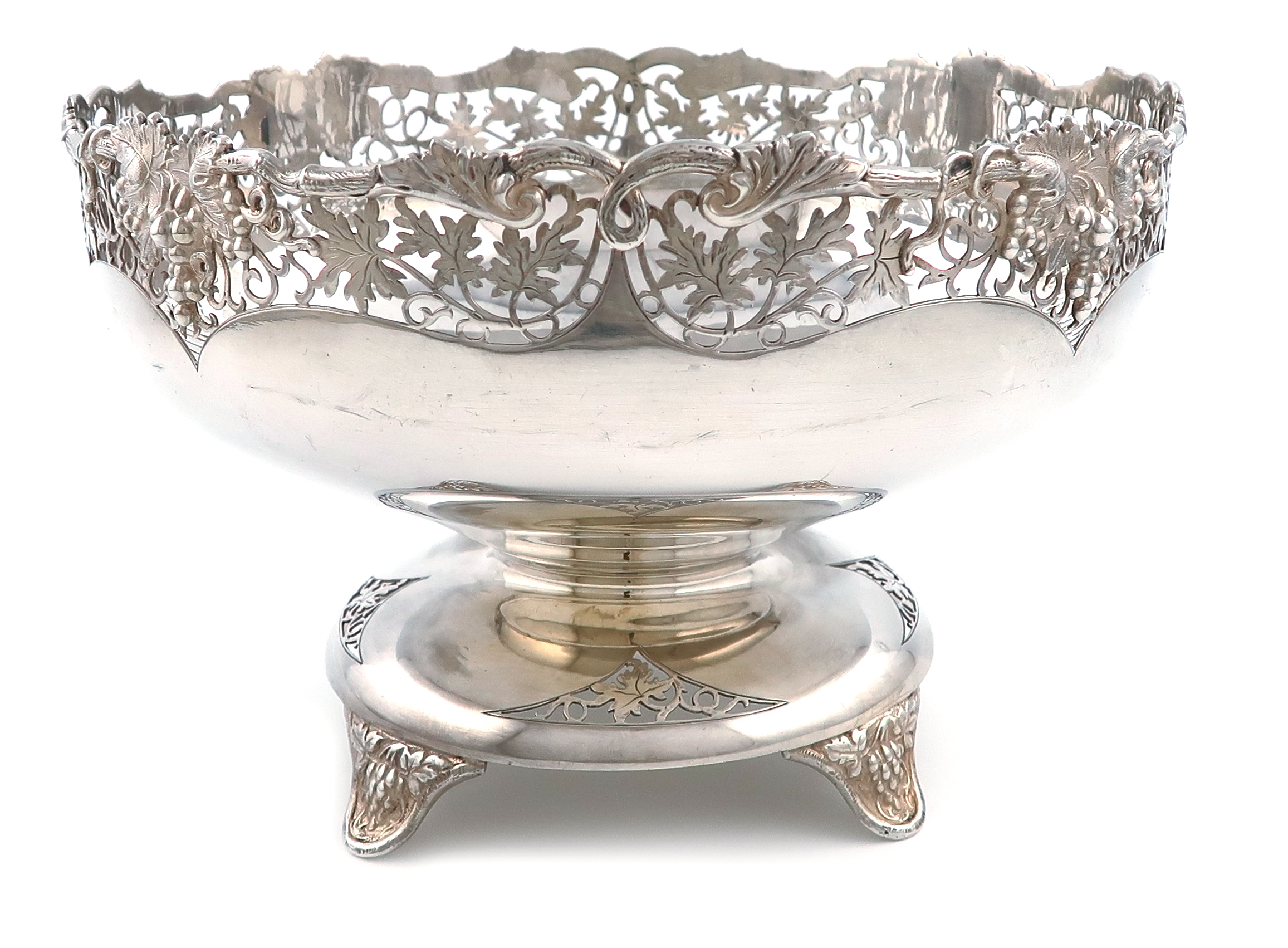 circular form, pierced trailing grape-vine decoration, on a raised pierced circular foot on four bracket feet, diameter 22cm, approx. weight 25oz.