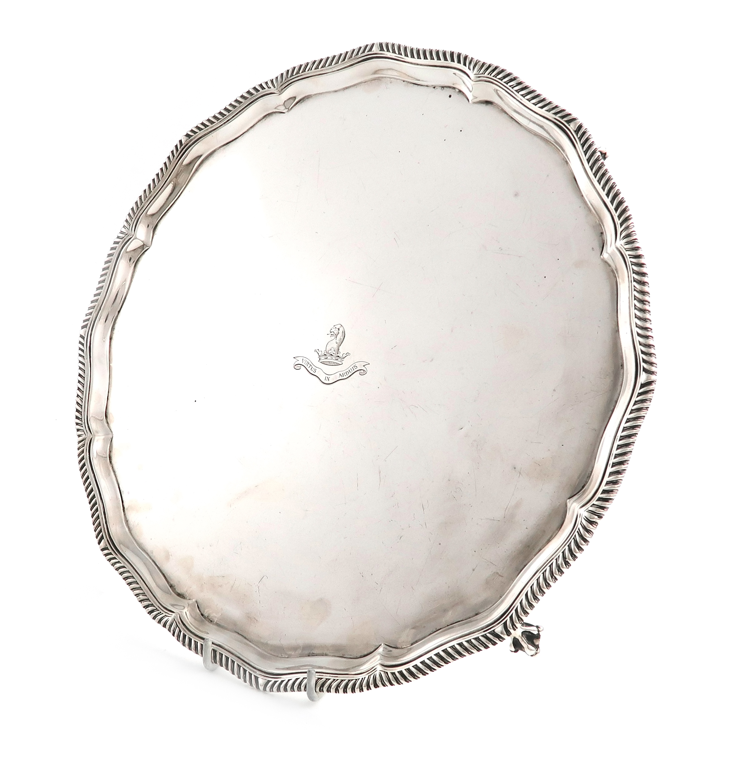 circular form, gadroon border, the centre with an armorial and motto, on four claw and ball feet, diameter 30.5cm, approx. weight 25.5oz.