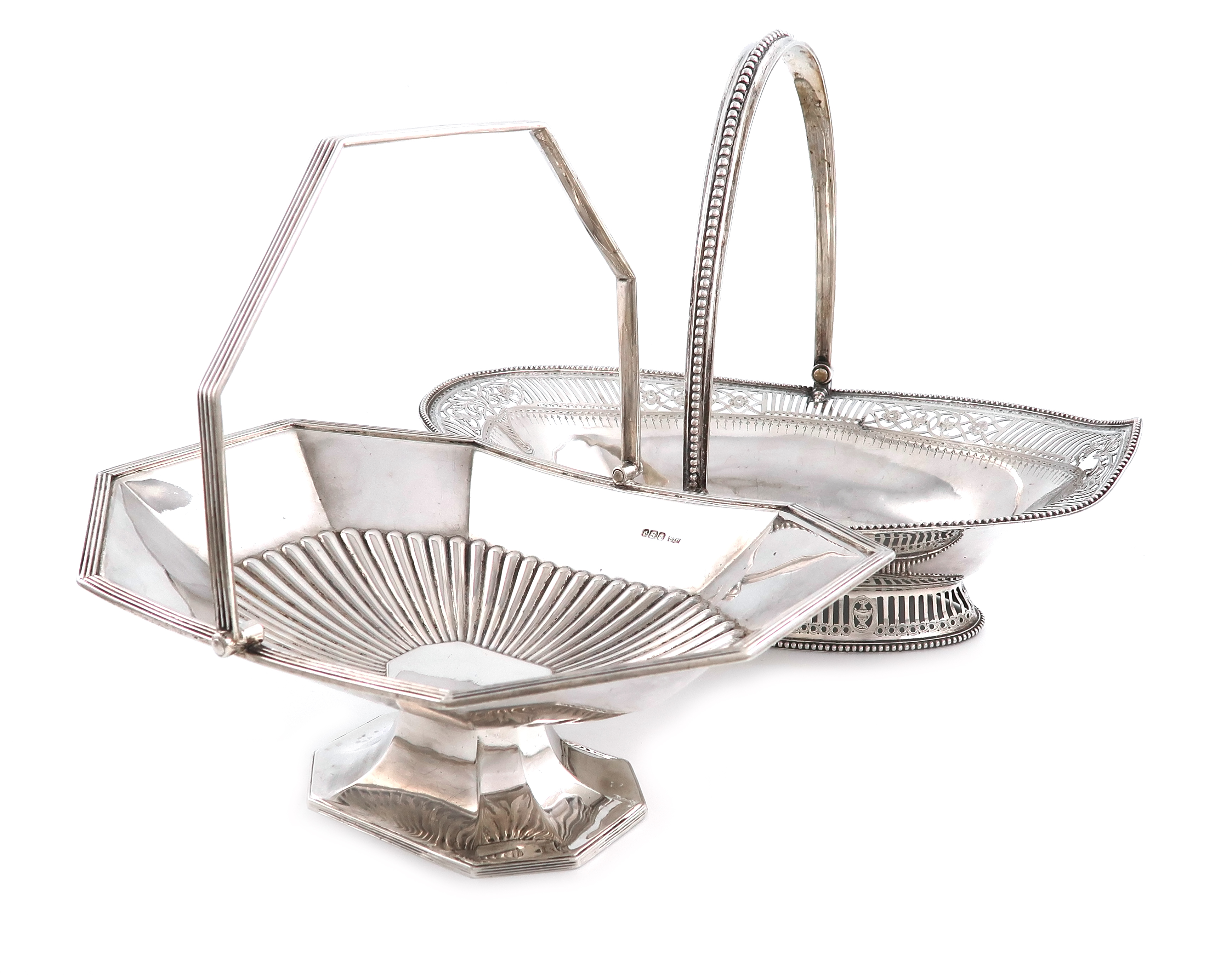 rectangular form, part-fluted decoration, reeded border and swing-handle, length 26.8cm, plus a George III silver swing-handled basket, by William Plummer, London 1783, oval form, pierced decoration, the centre with an armorial, damage to piercing, length 33cm, approx. total weight 47.8oz. (2)