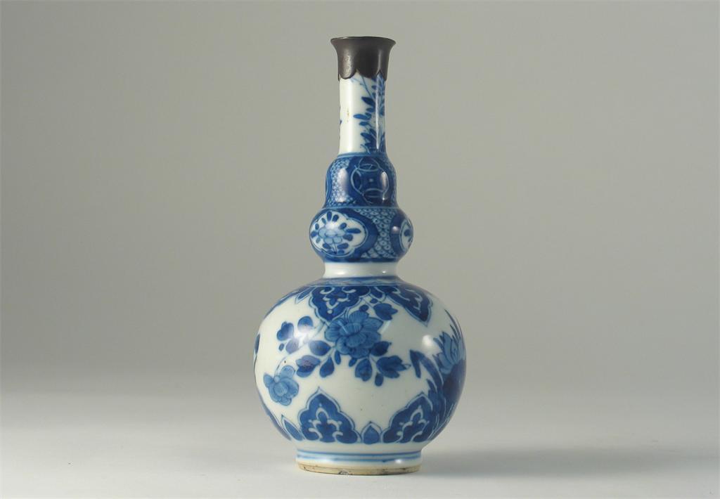 A Chinese blue and white gourd-shaped vase, decorated with lotus and other flowers. A metal mount to the rim. Kangxi 1662-1722, 15cm.