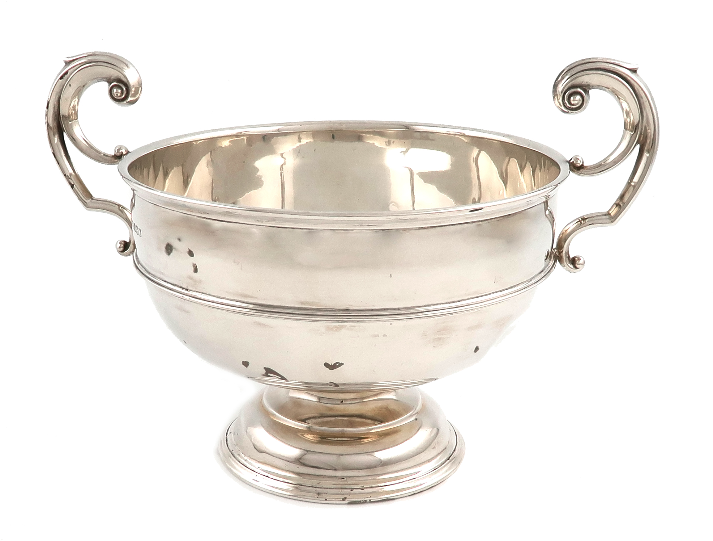 circular form, flying scroll handles, central girdle, on a raised circular foot, length handle to handle 25.8cm, approx. weight 18oz.