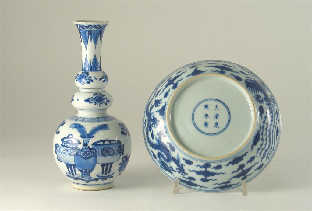 A Chinese blue and white saucer dish, painted with a phoenix and a dragon, Kangxi mark and of the period 1662-1722, and a Kangxi blue and white gourd shaped vase. Both damaged. 19cm. Max. (2)