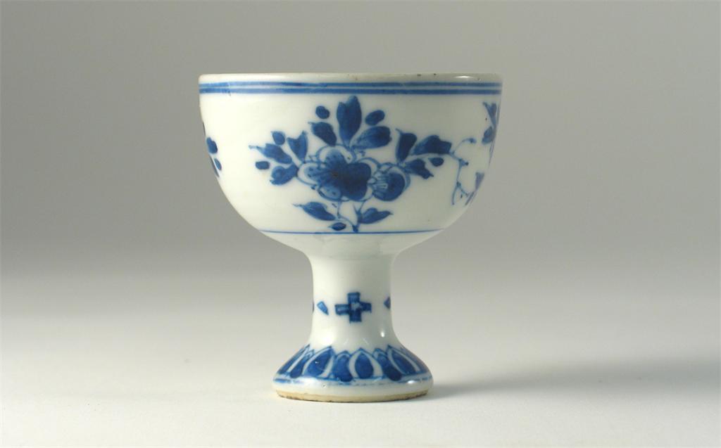 A Chinese blue and white stem cup, painted with four flower sprays, Kangxi 1662-1722, 6.5cm.