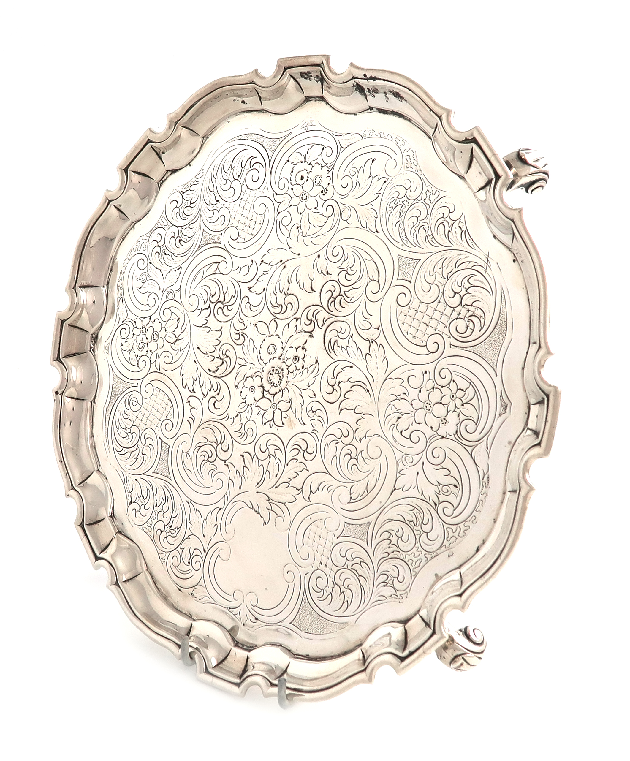 circular form, moulded border, the centre with chased foliate scroll decoration, on three gnarl feet, diameter 27.5cm, approx. weight 22.7oz.