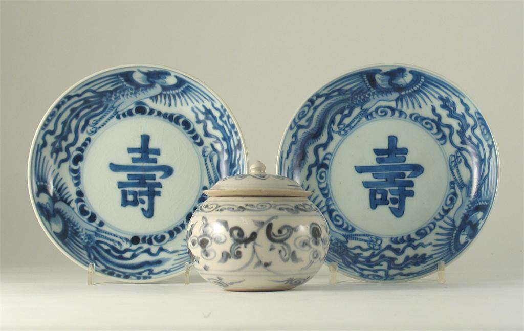 A pair of Chinese blue and white saucer dishes, each decorated with a single character encircled by three phoenix, twin fish marks. One dish with a faint body crack. 18th/19th century, together with an Anamese blue and white jar and cover, 15th century, 16cm. Max. (4)