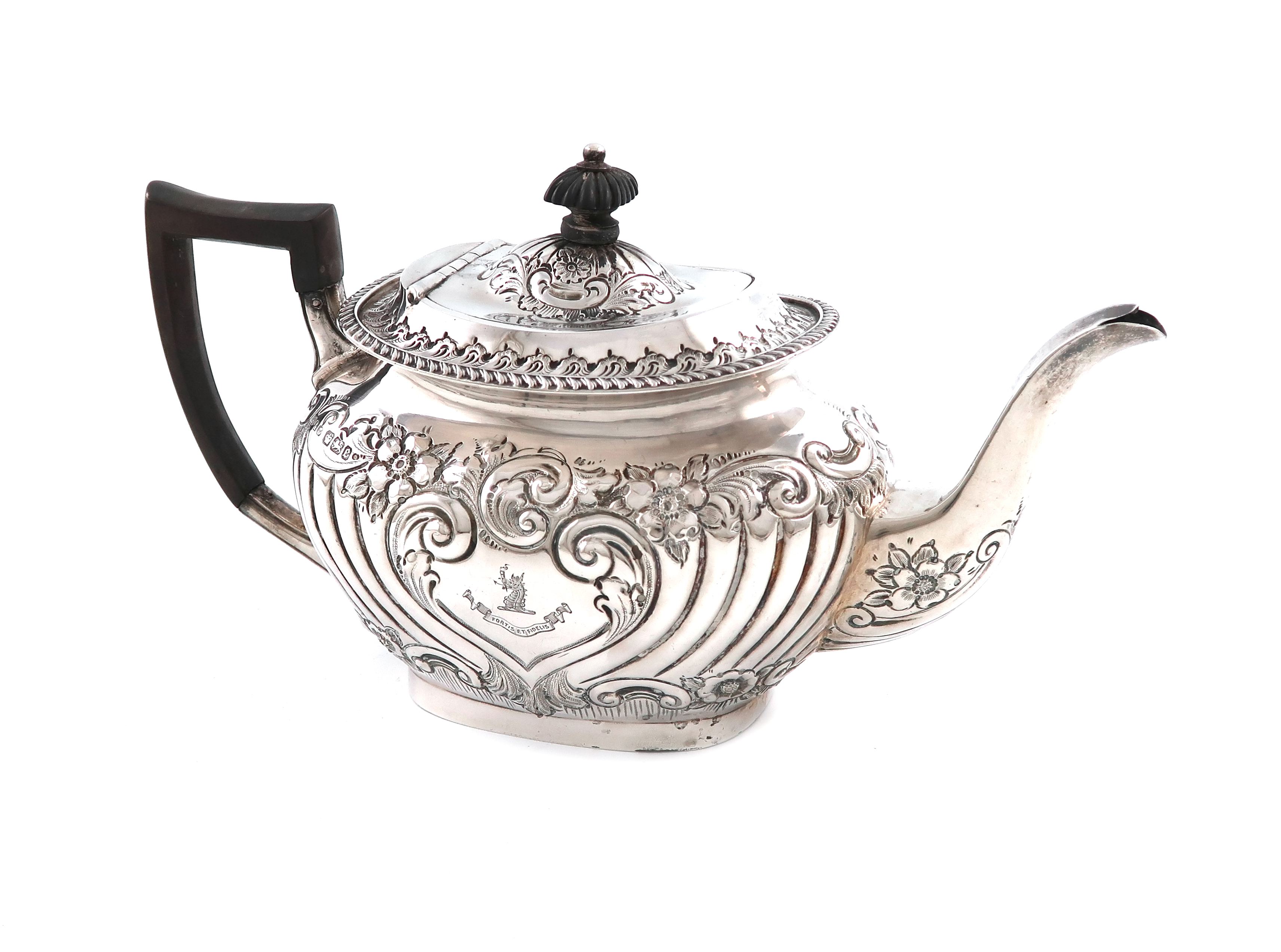 oblong bellied form, embossed foliate scroll and fluted decoration, engraved with a crest, length handle to spout 24cm, approx. weight 12.5oz.
