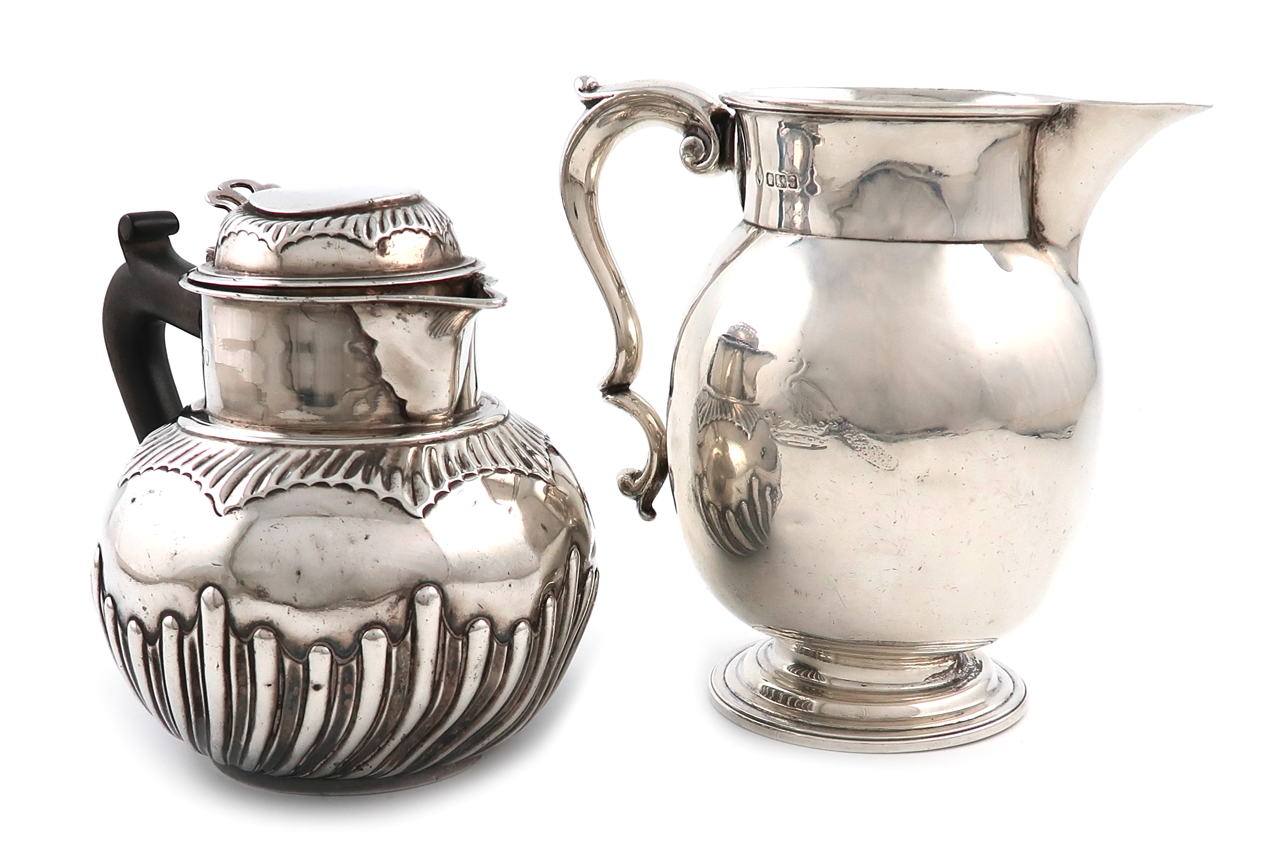 baluster form, scroll handle, engraved with a crest, on a circular foot, height 14.5cm, plus a silver hot water pot, by Charles Stuart Harris, London 1891, circular bellied form, part-fluted decoration, domed hinged cover, height 12.5cm, approx. total weight 22oz. (2)