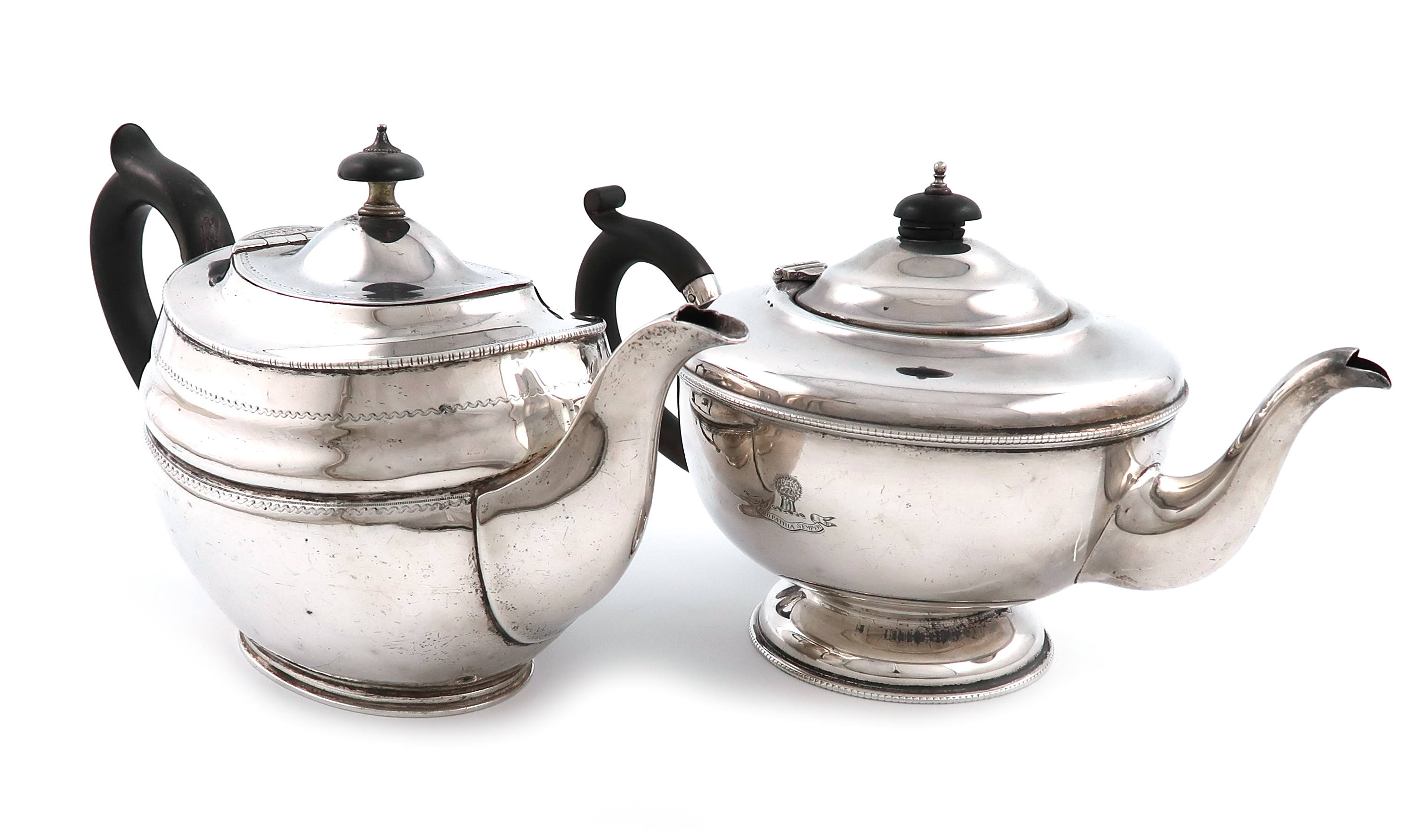 oval form, scroll handle, engraved borders, length handle to spout 25.5cm, plus a silver teapot, Birmingham 1931, circular form, beaded border, approx. total weight 31oz. (2)