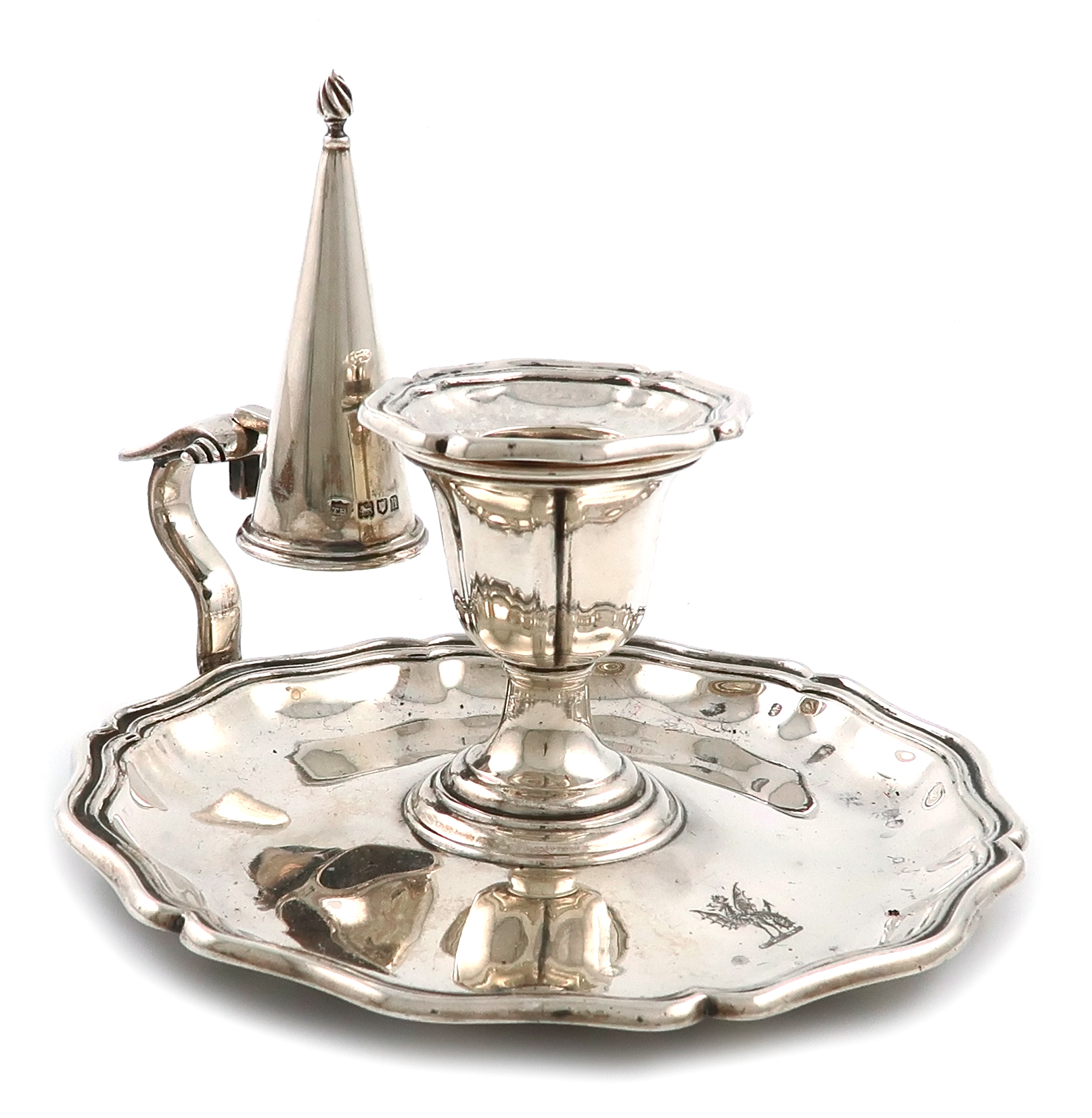 shaped circular form, moulded border, scroll handle, detachable drip pan, with a conical snuffer, engraved with a crest, diameter 15cm, approx. weight 8.8oz.