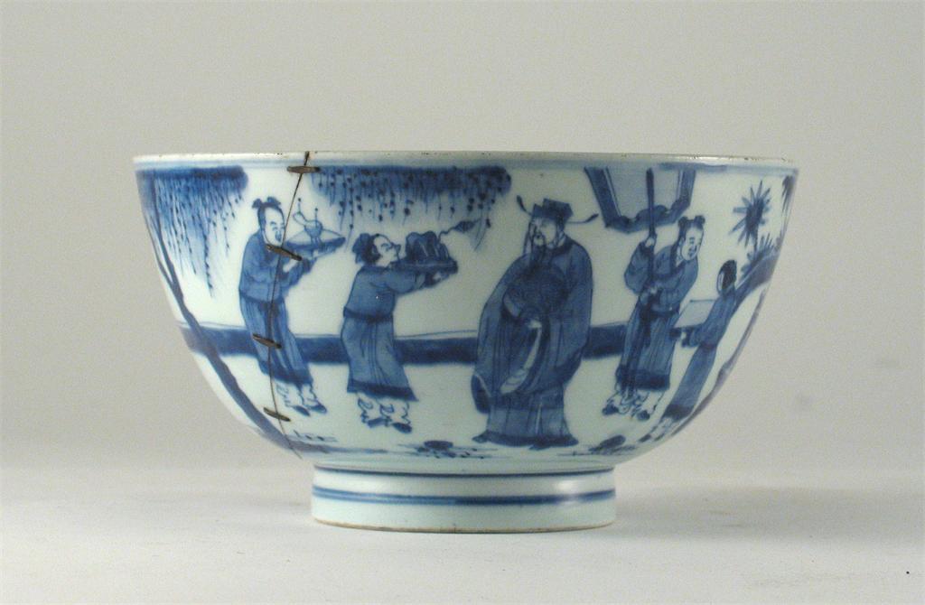A Chinese blue and white bowl, decorated with figures on a terrace beneath trees, lotus mark. Broken and with nine rivets. Kangxi 1662-1722, 20cm.