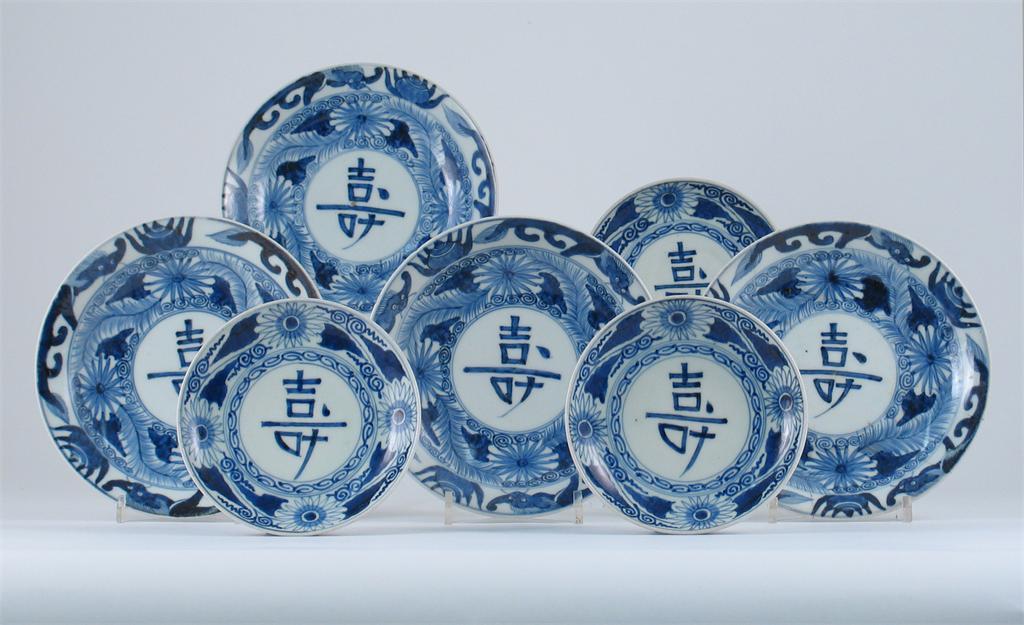 A set of four large and three similar smaller Japanese blue and white dishes, decorated with central characters encircled by flowers, foliage and stylized beasts, the bases with Ming marks. Minor faults. 18th century, 17.5cm. Max. (7)