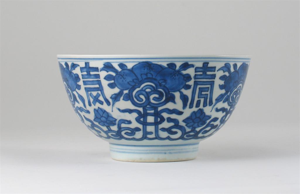 A Chinese blue and white bowl, the exterior painted with peaches divided by shou characters, lozenge mark to the base, Kangxi 1662-1722, 17cm.