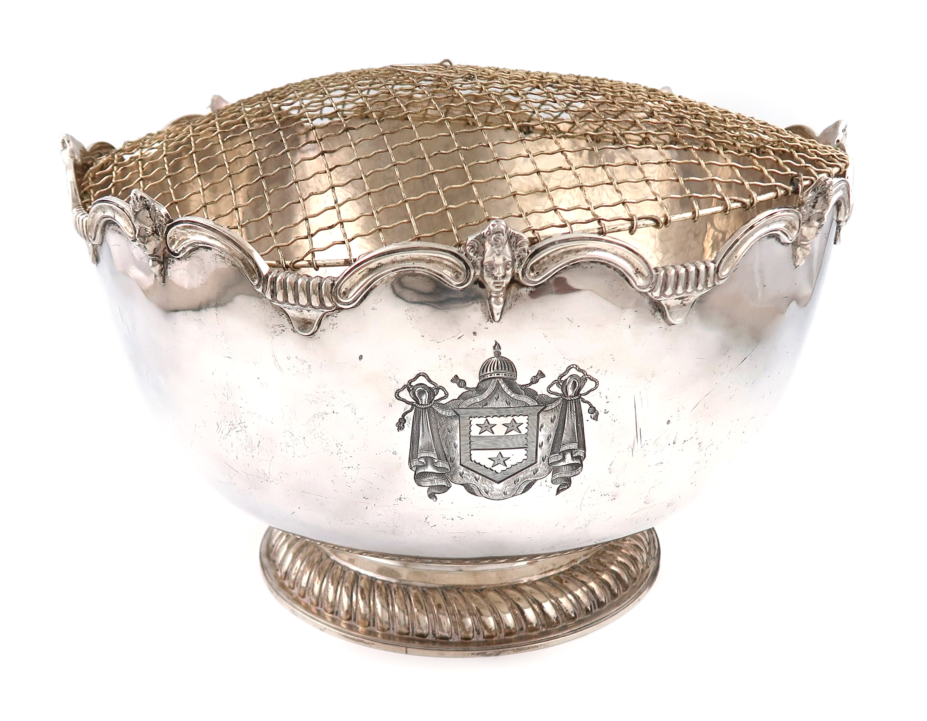 circular form, cherub head and scroll border, engraved with an armorial, on a raised circular fluted foot, with a later metal mesh flower holder, inscribed, diameter 36cm, height 22.5cm, approx. weight 76oz.