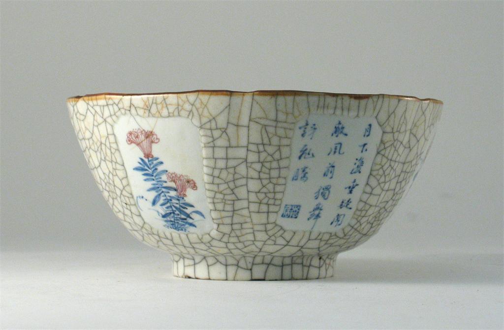 A rare Chinese crackle-glaze moulded bowl, decorated with six panels containing flowers and calligraphy. Chips beneath the footrim. 18th century, 20cm. Paper label for the Raffungst Collection.