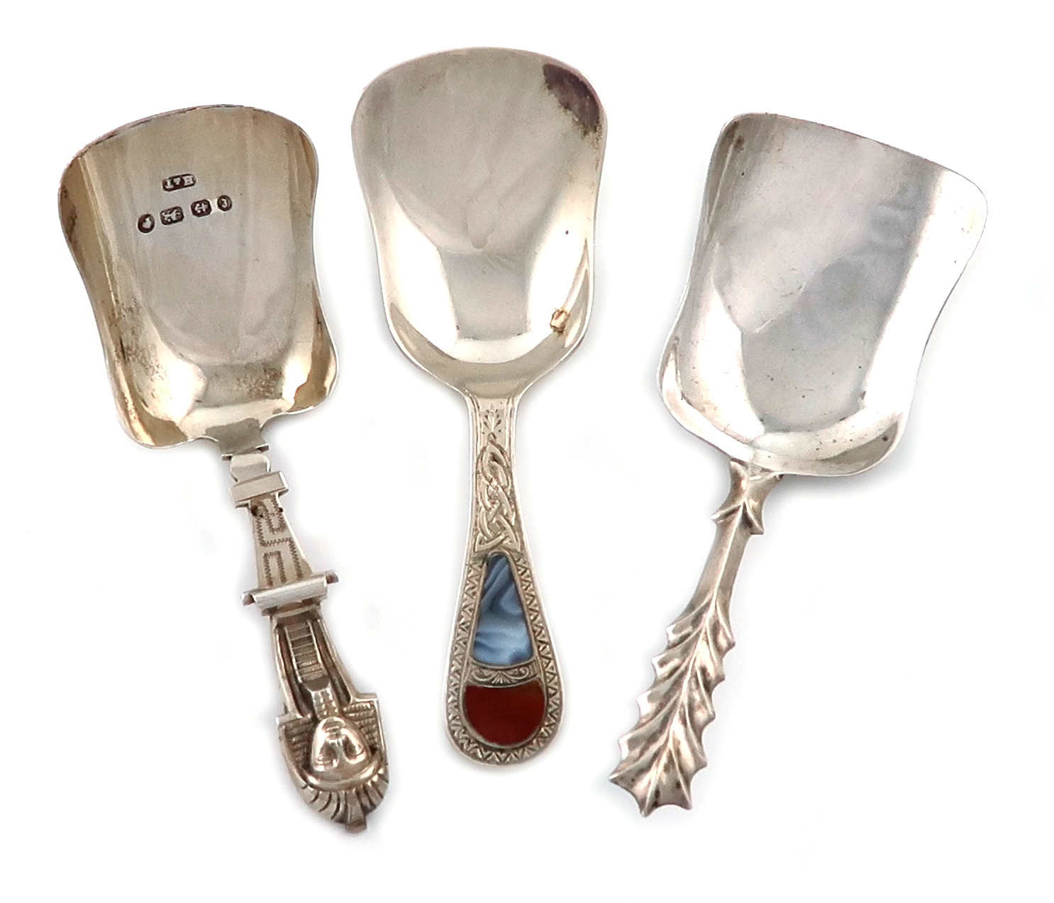 comprising: a Victorian one, by Hilliard and Thomason, Birmingham 1879, shell bowl, the with a Pharaoh head terminal, length 9cm, plus one set with agates, by Joseph Cook & Son, Birmingham 1929, and one with a leaf handle, by John Hilliard, Birmingham 1837, approx. total weight 1.1oz.