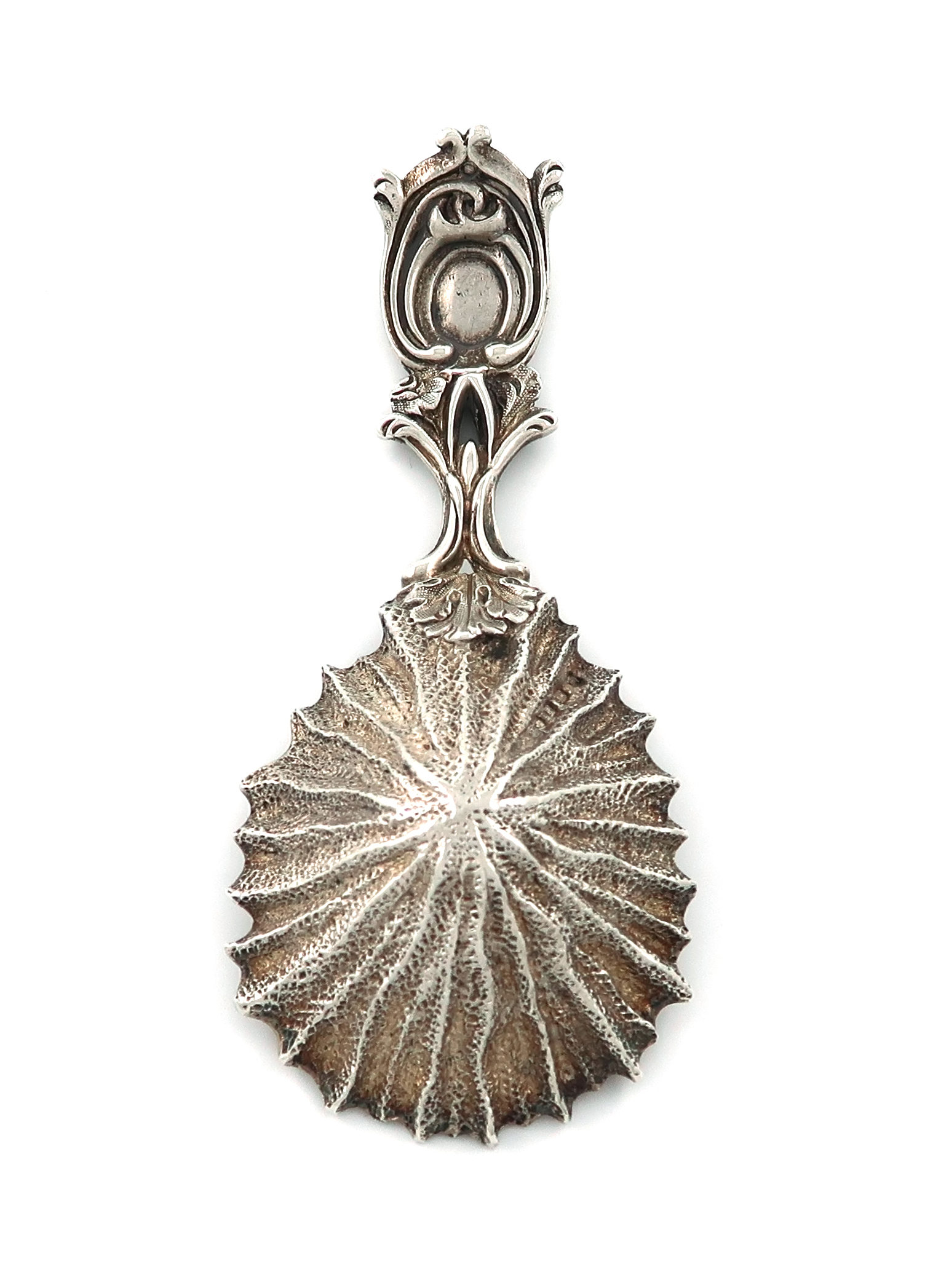 the bowl cast as a limpet shell, the handle with pierced and foliate scroll decoration, length 10.8cm, approx. weight 1.3oz.