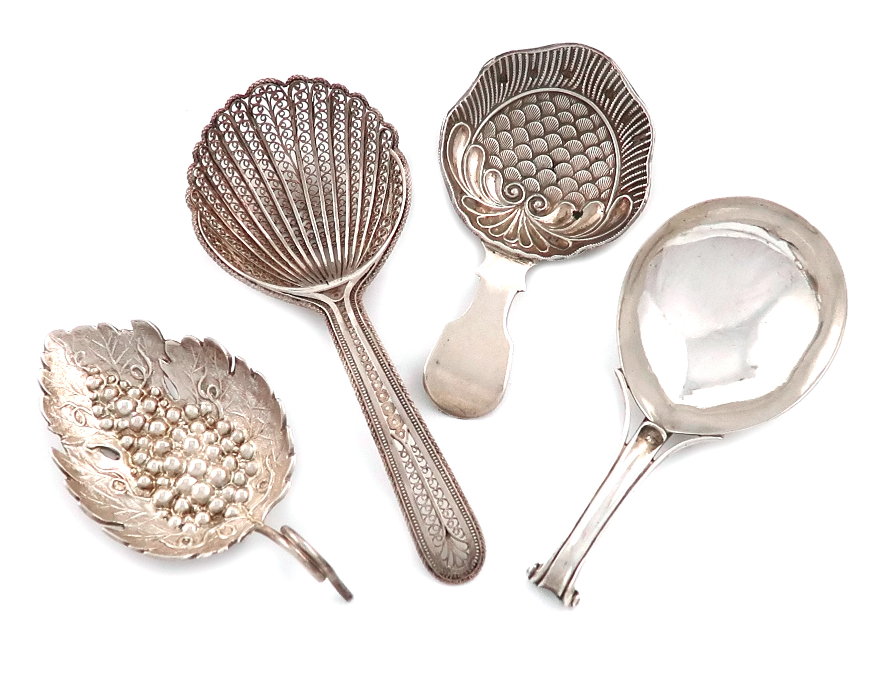 comprising: a George III one by George Smith, London 1787, bifurcated scroll handle, one of vine-leaf form, embossed with a bunch of grapes, wire-work handle, one with a shaped circular bowl with fluted and 'fish-scale' decoration, and a filigree caddy spoon with a fluted bowl, approx. weight 1.2oz. (4)