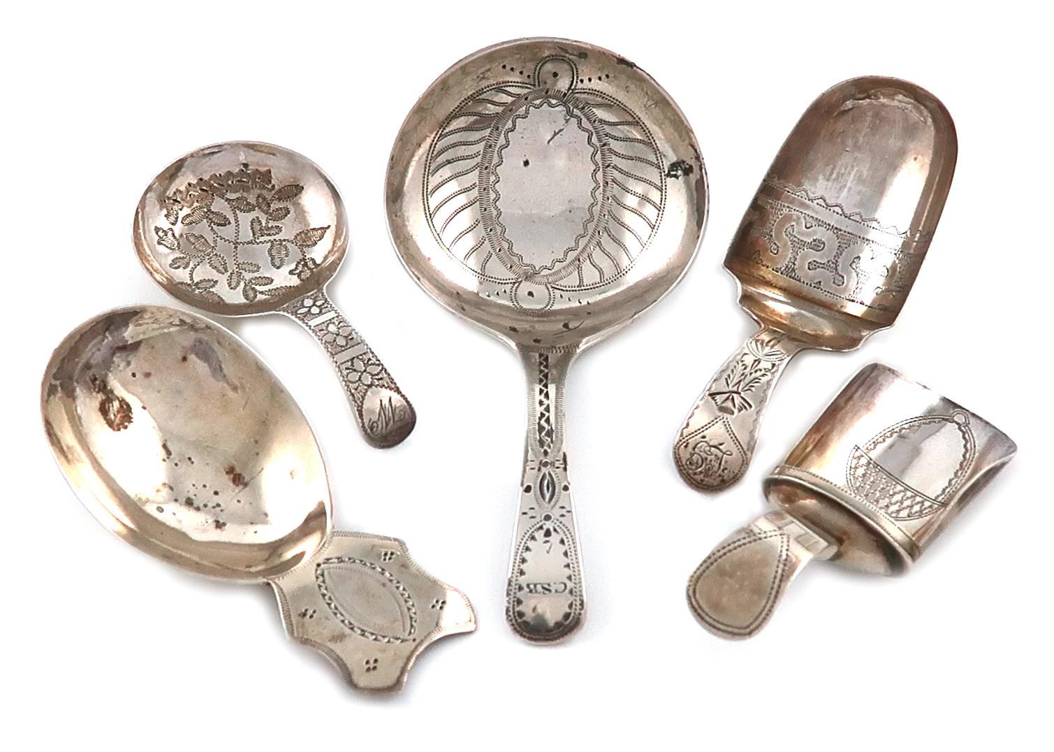 including: a George III one of shovel form, by Cocks and Bettridge, Birmingham 1806, another engraved with an acorn, another by the same maker, Birmingham 1808, engraved decoration, and three others, approx. weight 1.4oz. (5)
