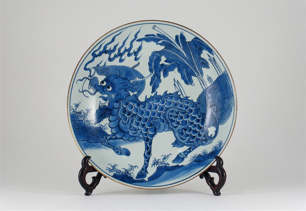 A large Chinese blue and white saucer dish, boldly painted with a scaly kylin, the sides with plantain, the base with a channelled footrim, c.1670, 35cm.