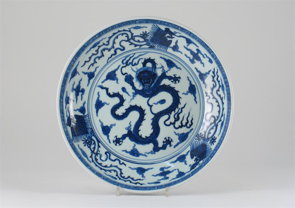 A Chinese blue and white dish, the centre painted with a dragon clasping a pearl of wisdom, encircled by three phoenix in flight. A faint rim crack. Qianlong 1736-95, 28.5cm.