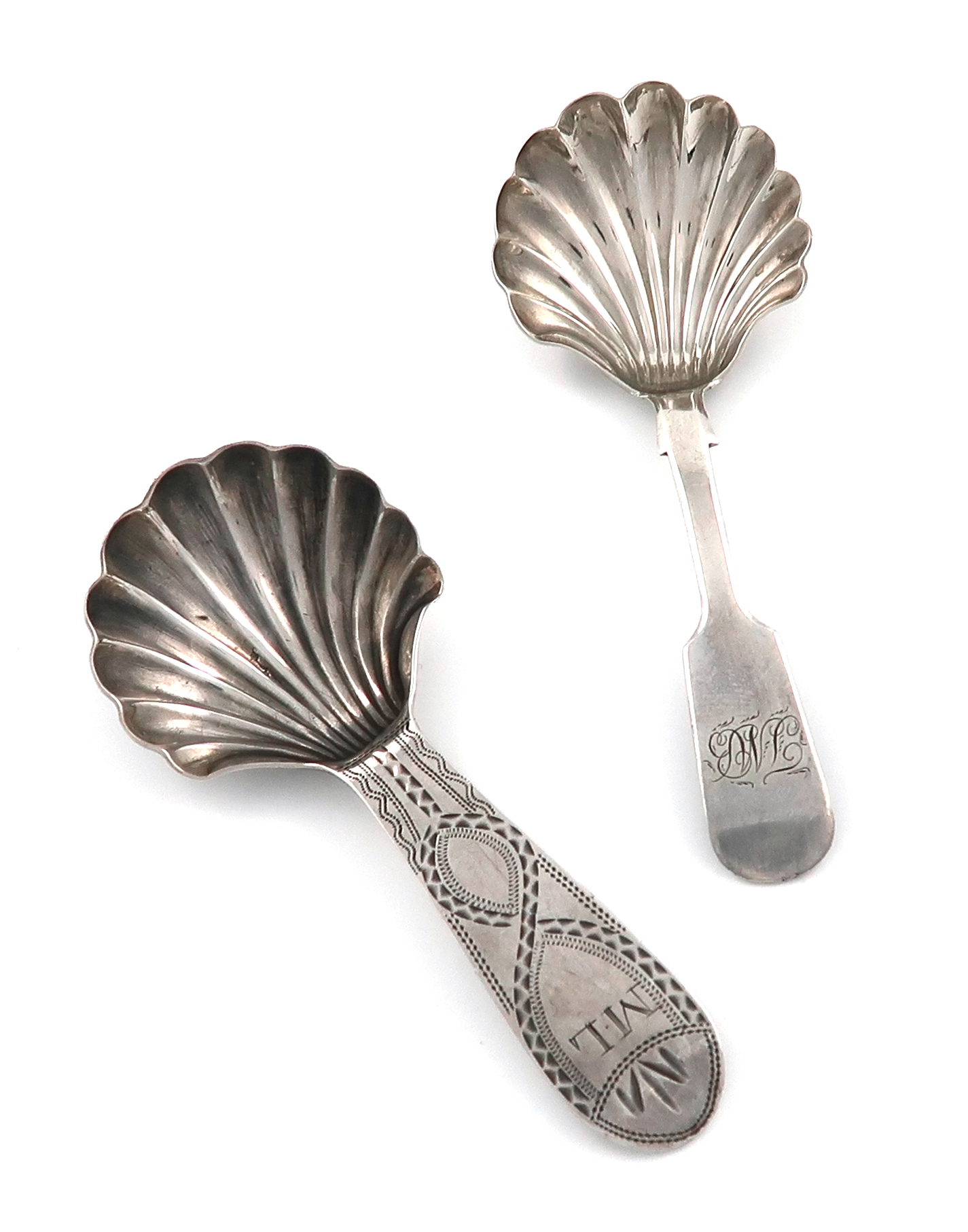 fluted shell bowl, the terminal with scratch initials, length 9.3cm, plus a Victorian silver caddy spoon, by Thomas Sewell, Newcastle 1850, Fiddle pattern, shell bowl, initialled, approx. total weight 0.6oz. (2)