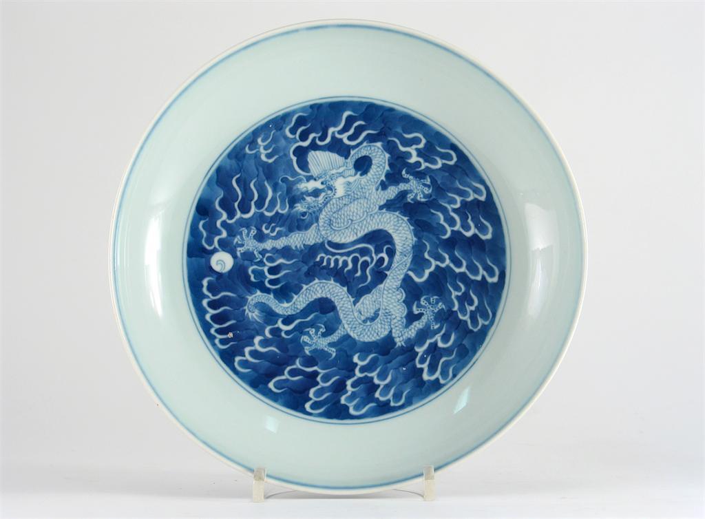 A Chinese blue and white saucer dish, the centre and the reverse painted with dragons in pursuit of the flaming pearl, Yongzheng six character mark and possibly of the period, 21.6cm.