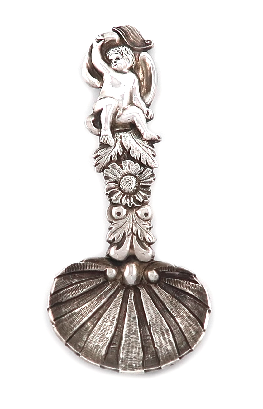 fluted shell bowl with alternate matted decoration, the handle with a cherub and foliate decoration with scroll motifs, the reverse of the handle with a crest and motto, length 11.4cm, approx. weight 1.1oz.