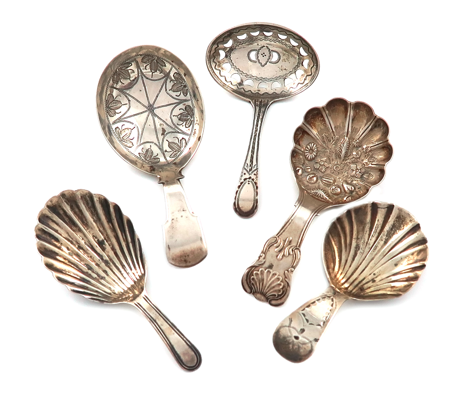 including: a William IV one by F. Clark, Birmingham 1834, King's pattern handle, embossed foliate bowl, one by George Burrows, London 1800, the oval bowl with pierced and engraved decoration, and three others, approx. weight 1.4oz. (5)