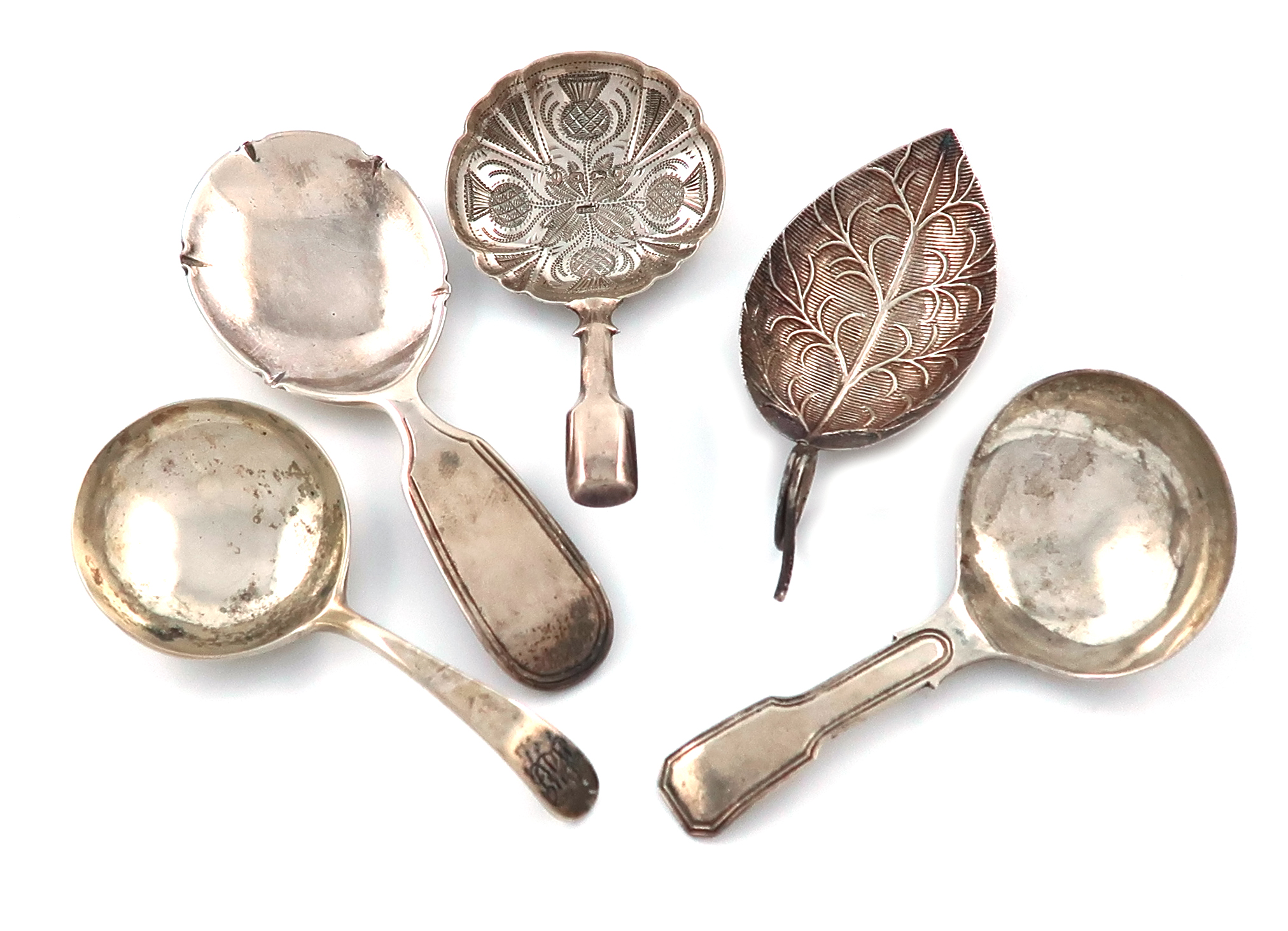 including: a George III one of leaf form, by Joseph Taylor, Birmingham 1798, a Victorian caddy spoon, by Hilliard and Thomson, Birmingham 1865, circular bowl, engraved with thistles, and three others, approx. weight 2oz. (5)