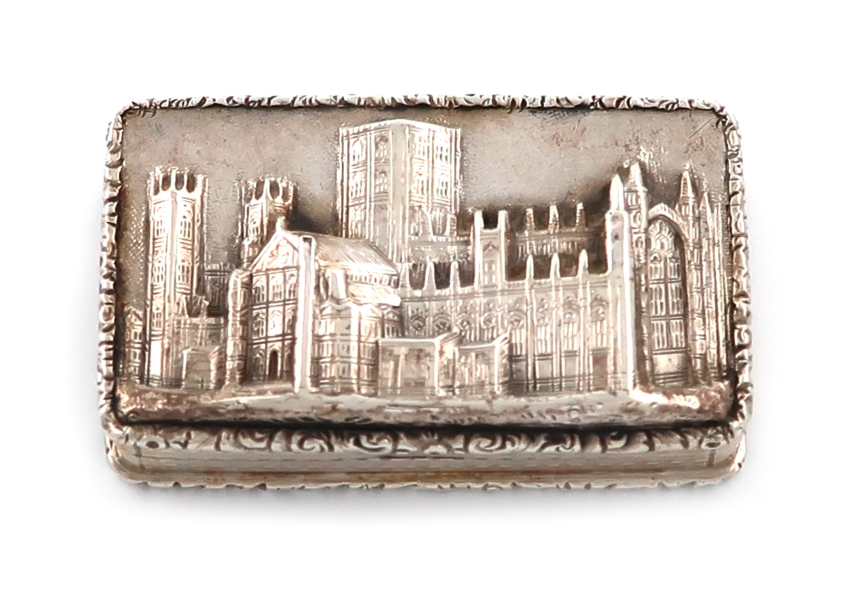 rectangular form, engine-turned sides and base, the hinged cover with a scene of the Minster, the underside with a vacant shield cartouche, the interior with a pierced and engraved silver-gilt grille, length 4.8cm, approx. weight 1.3oz.