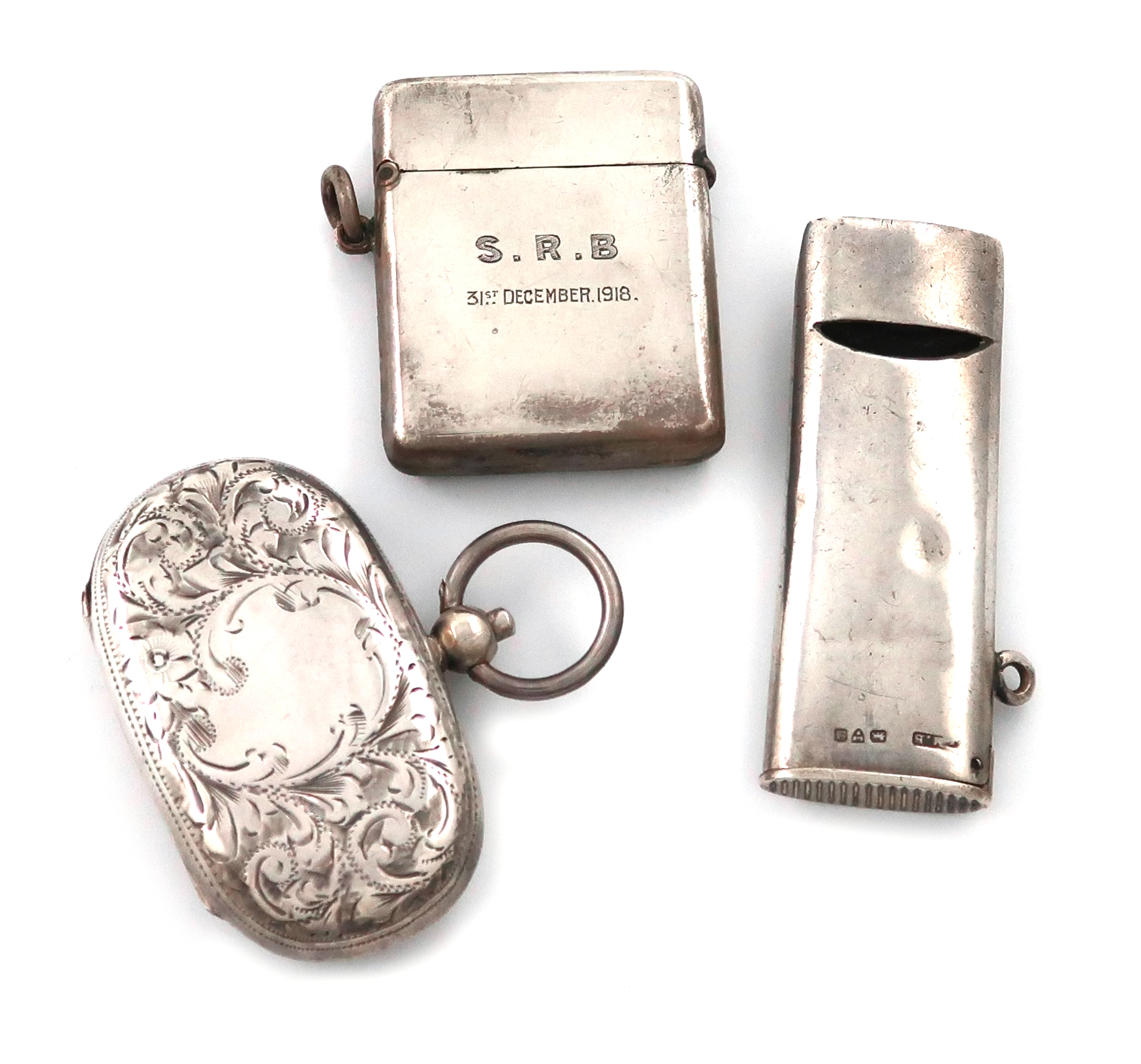 oblong rectangular form, with a ring attachment, plus a silver butt marker case, by J. Vickery, London 1918, lacking markers, inscribed, plus a double sovereign case, Birmingham 1900, approx. weight 2.2oz.