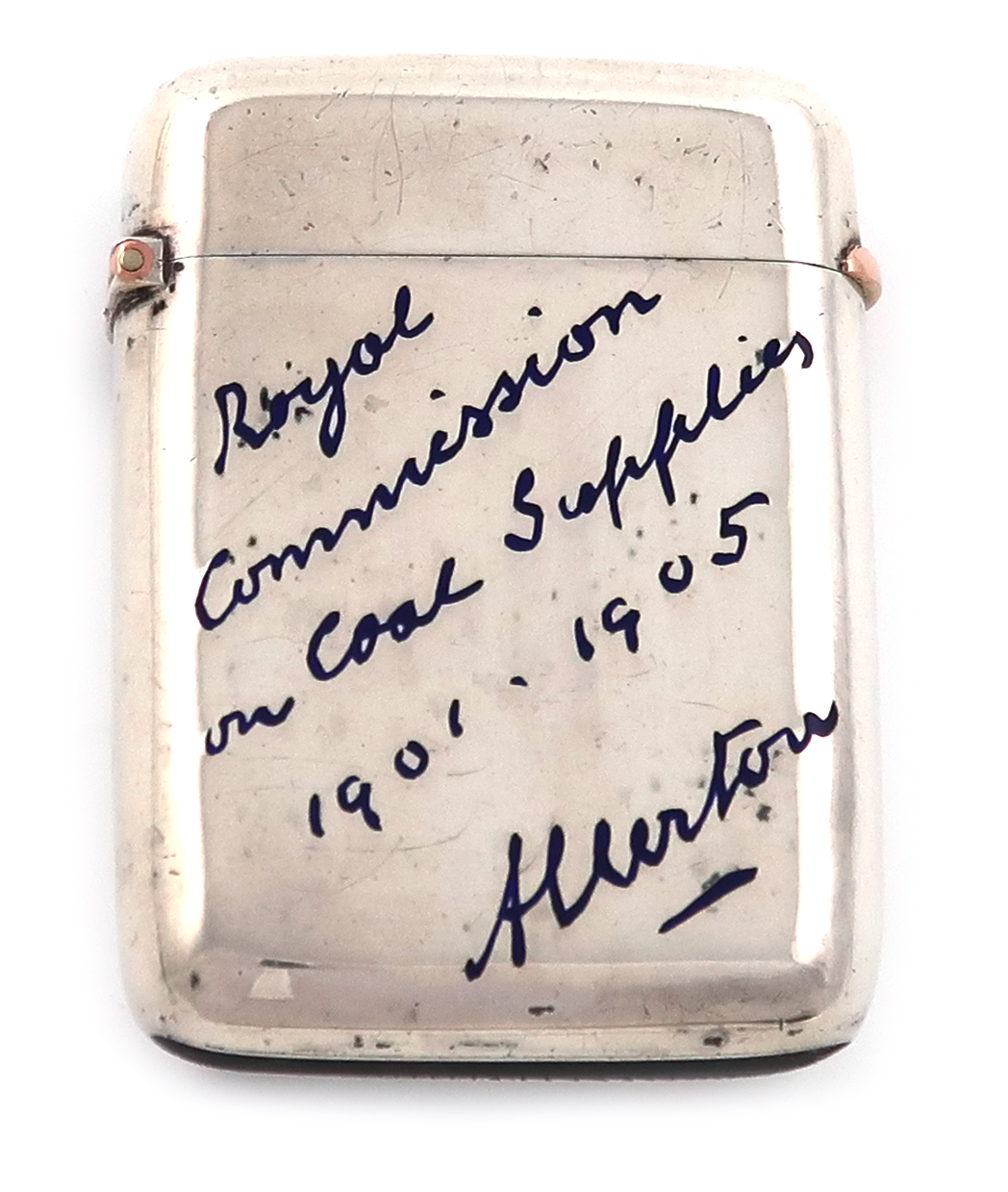 rectangular form, hinged cover, the front enamelled in blue 'Royal Commission on Coal Supplies, 1901-1905, Allerton', length 5.3cm, approx. weight 1.2oz.