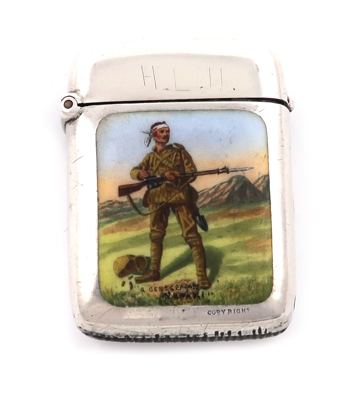 Boer War interest, a late-Victorian silver and enamel vesta case,