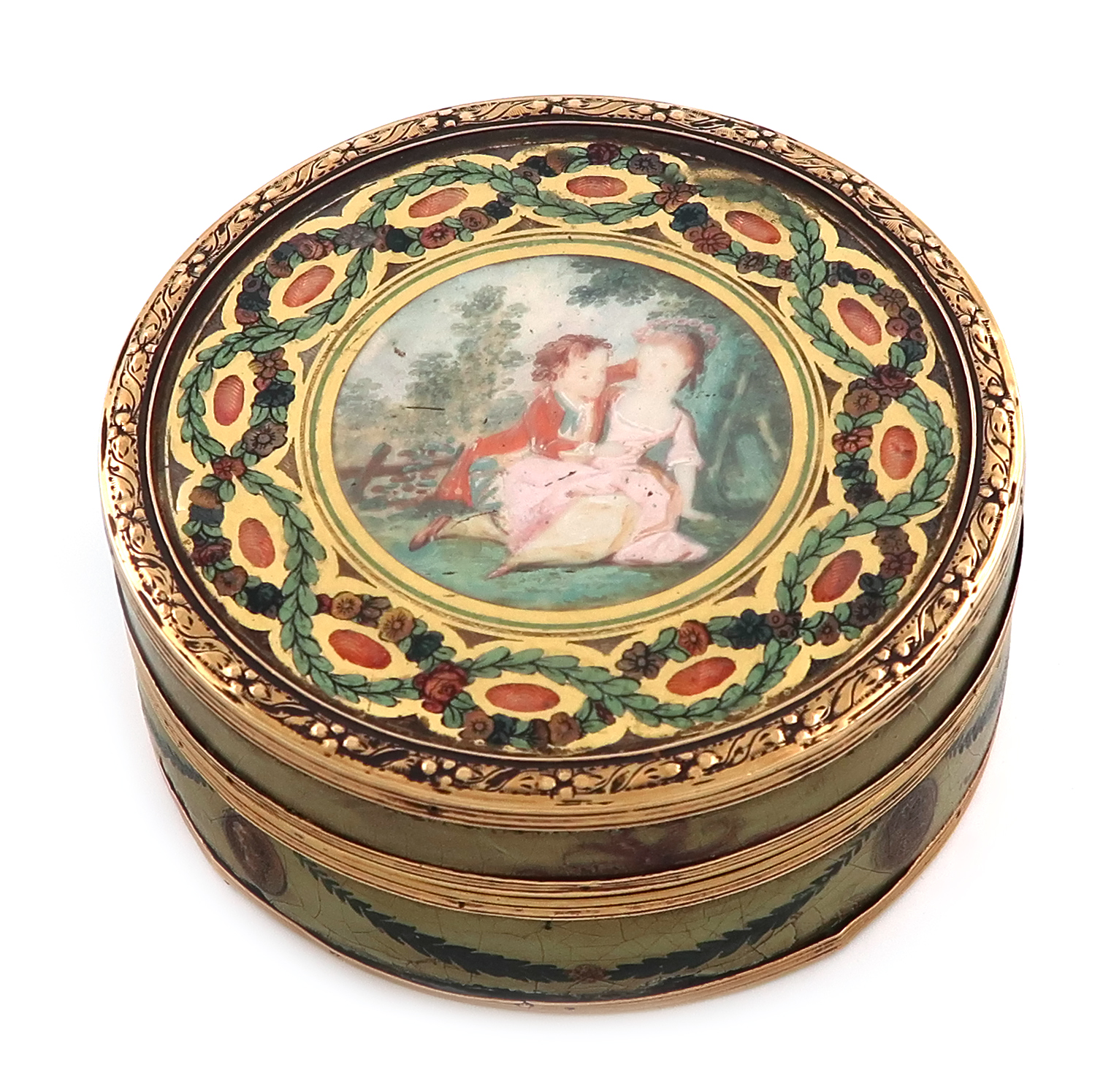 circular form, the centre with a playful scene of a lady and gentleman with foliate borders under glass, the composition sides and base with classical scene, medallions and swags, tortoiseshell lined, diameter 7.8cm.