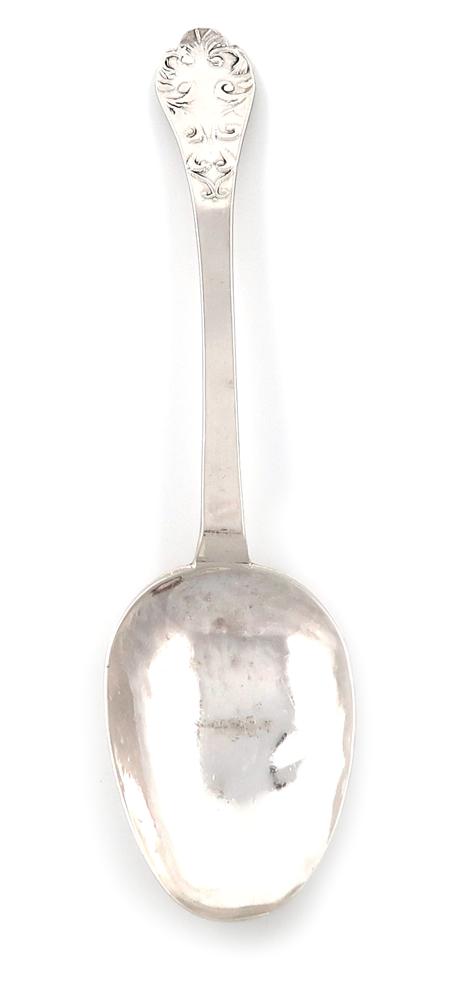 the terminal and reverse of the oval bowl with foliate scroll decoration, the reverse of the terminals with prick dot initials 'R.W' over 'TH' '1706', length 19.8cm, approx. weight 1.4oz.