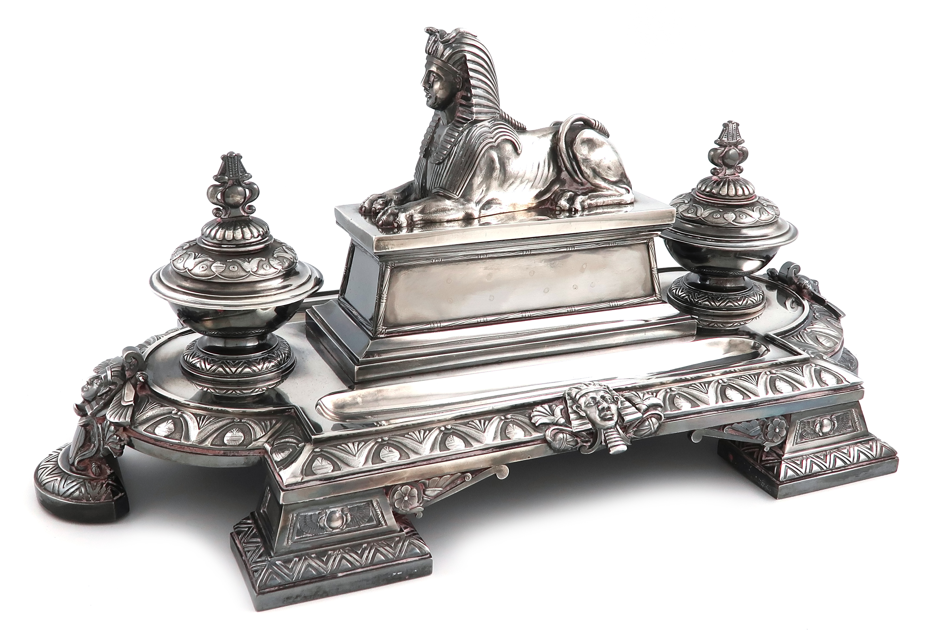 in the Egyptian manner, rounded rectangular form, with a central box, the hinged cover mounted with a large sphinx, the two inkwells with palm decoration on matted background, the hinged covers with crown finials, the borders with Egyptian motifs and with masks, with two pen wells, on four rectangular and two rounded rectangular feet, length 48cm, approx. weight 110oz.