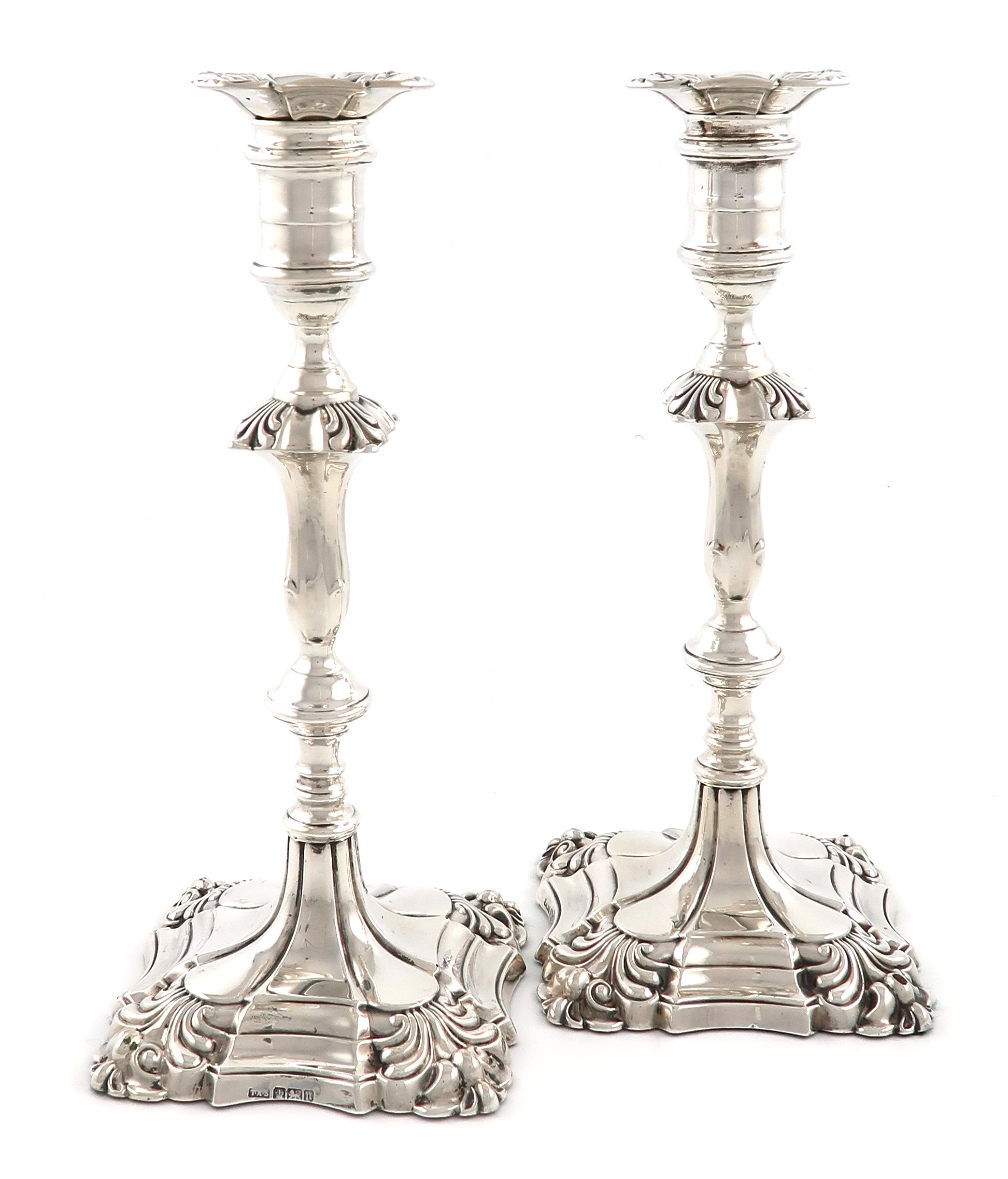 in the mid-18th century manner, knopped stems, shell capped shoulders, spool-shaped capitals, on raised shaped square bases, removable drip pans, height 24.9cm. (2)
