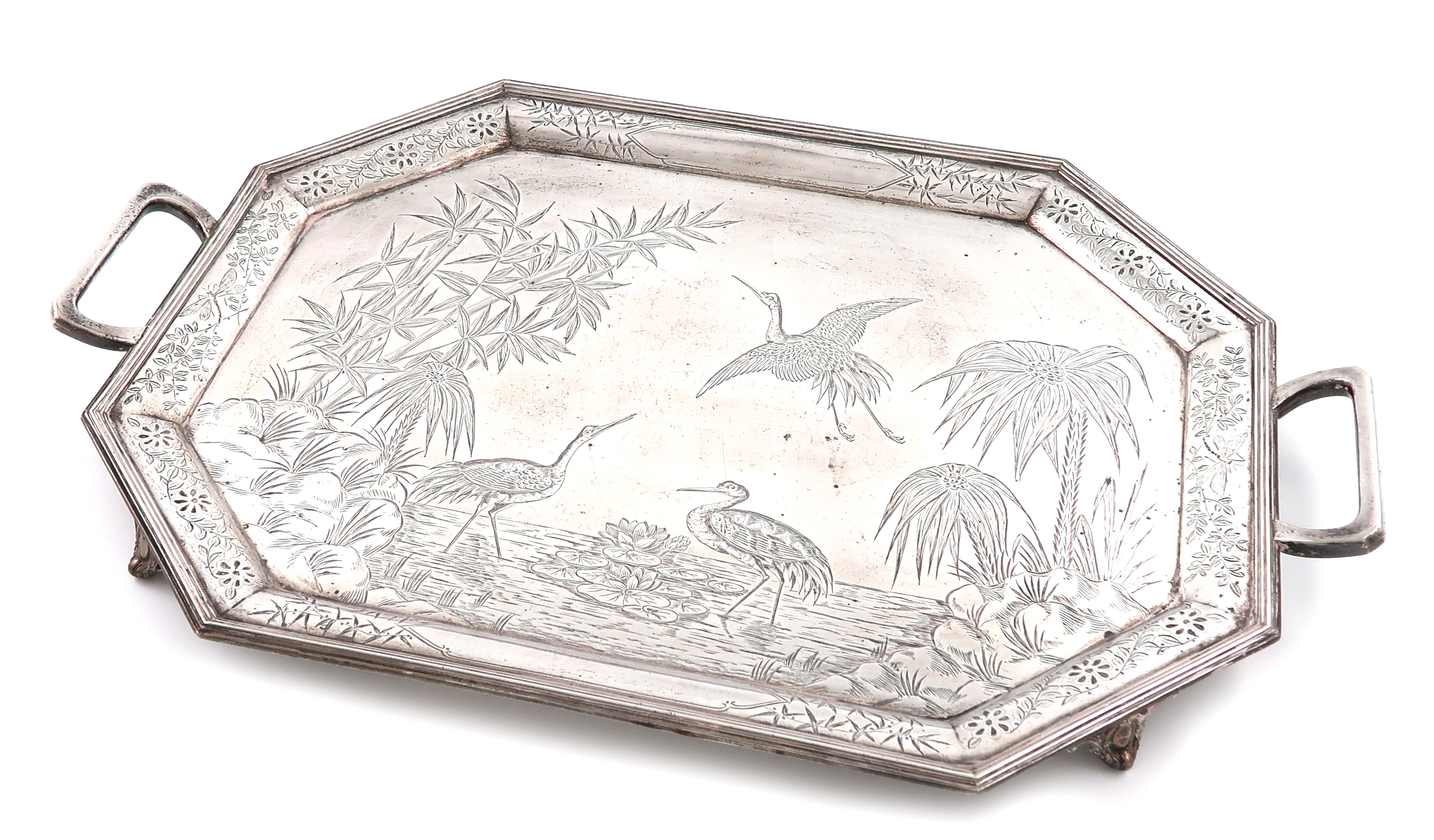 rectangular form, canted corners, the centre engraved with bamboo and foliate decoration and cranes flying and wading in water with lily pads, reeded borders, on four bracket feet, length 50cm, approx. weight 54.9oz.