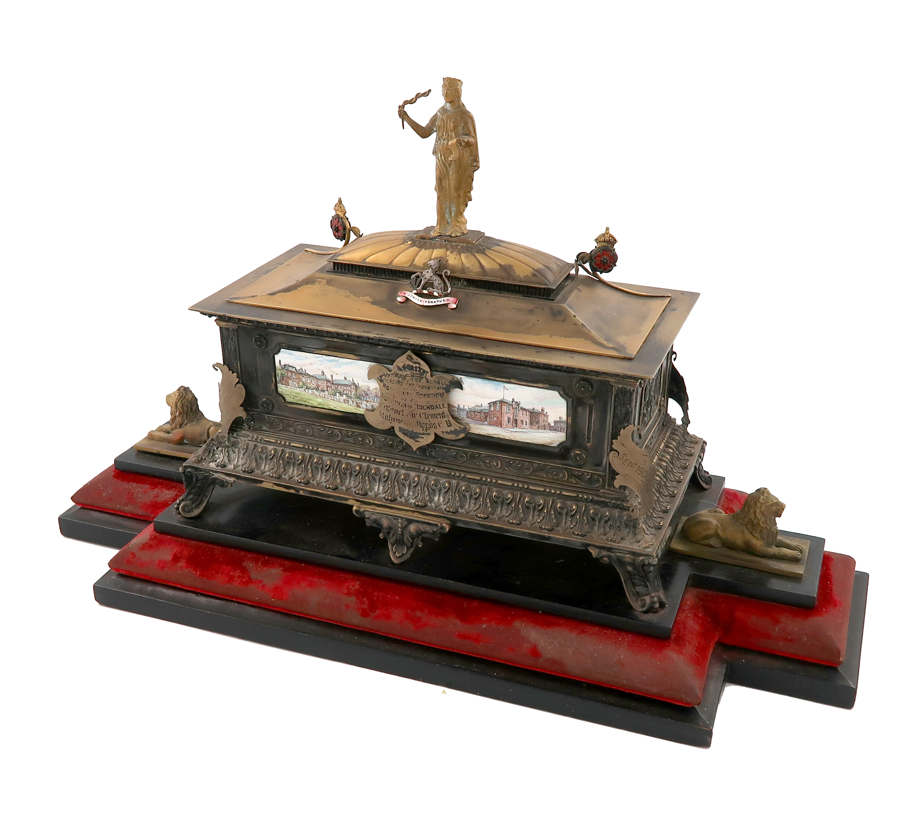 rectangular form, the front and back with enamelled plaques of buildings, the sides with foliate panels, acanthus leaf border, the front enamelled with the arms of Rochdale, the reverse with a presentation inscription, the pull-off cover with a figure of a lady, with two enamelled red Tudor roses, and with an enamelled crest, on a shaped rectangular base, mounted with two recumbent lions, the interior with a presentation scroll from the Borough of Rochdale, length of casket 25.5cm, total length on stand 45cm,