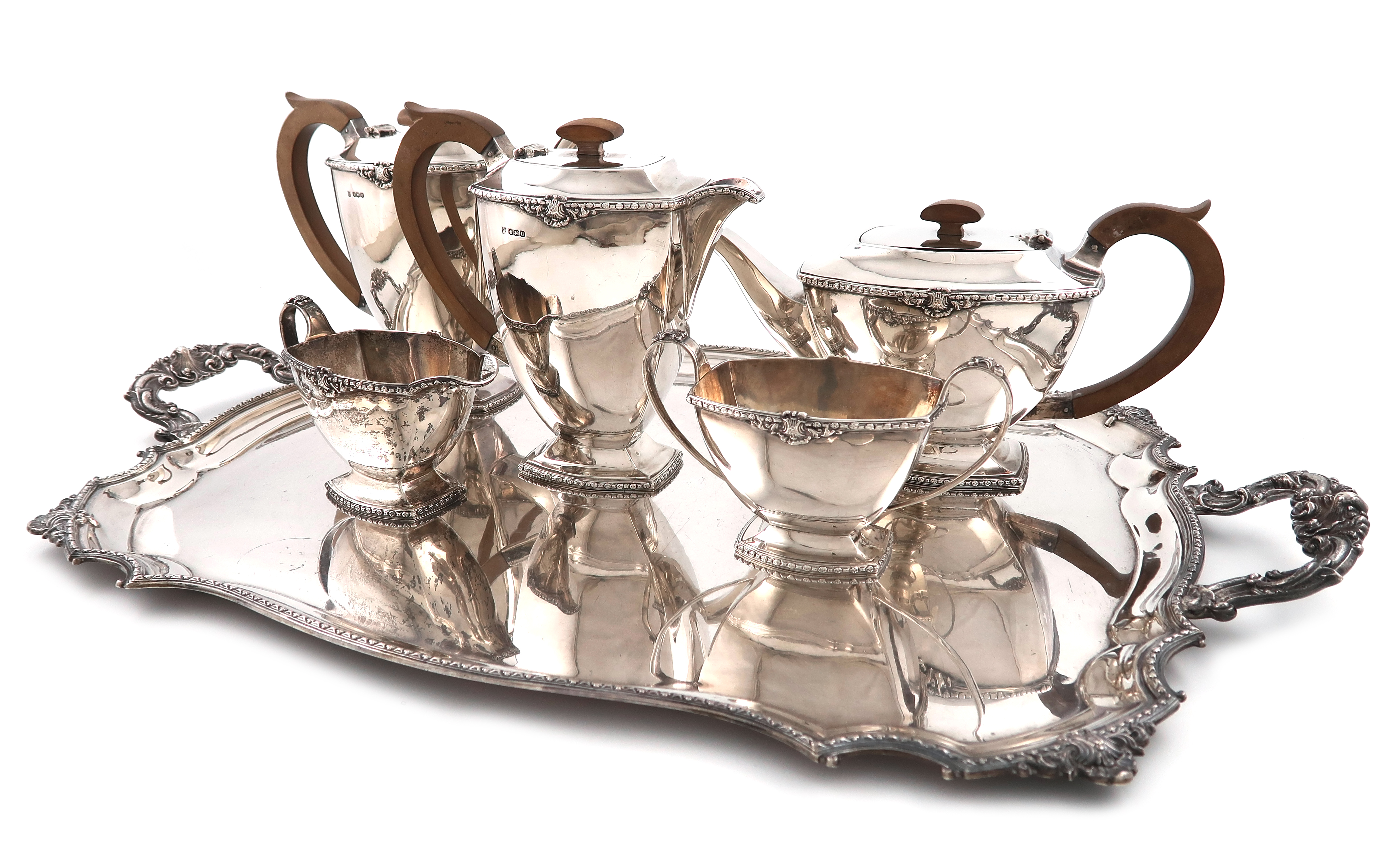 in the Art Deco manner, shaped tapering rectangular form, scroll handles, stylised borders with shell motifs, the two handled tray of shaped rectangular form, with similar borders, height of coffee pot 20cm, length handle to handle 67.5cm, approx. weight 194oz. (6)