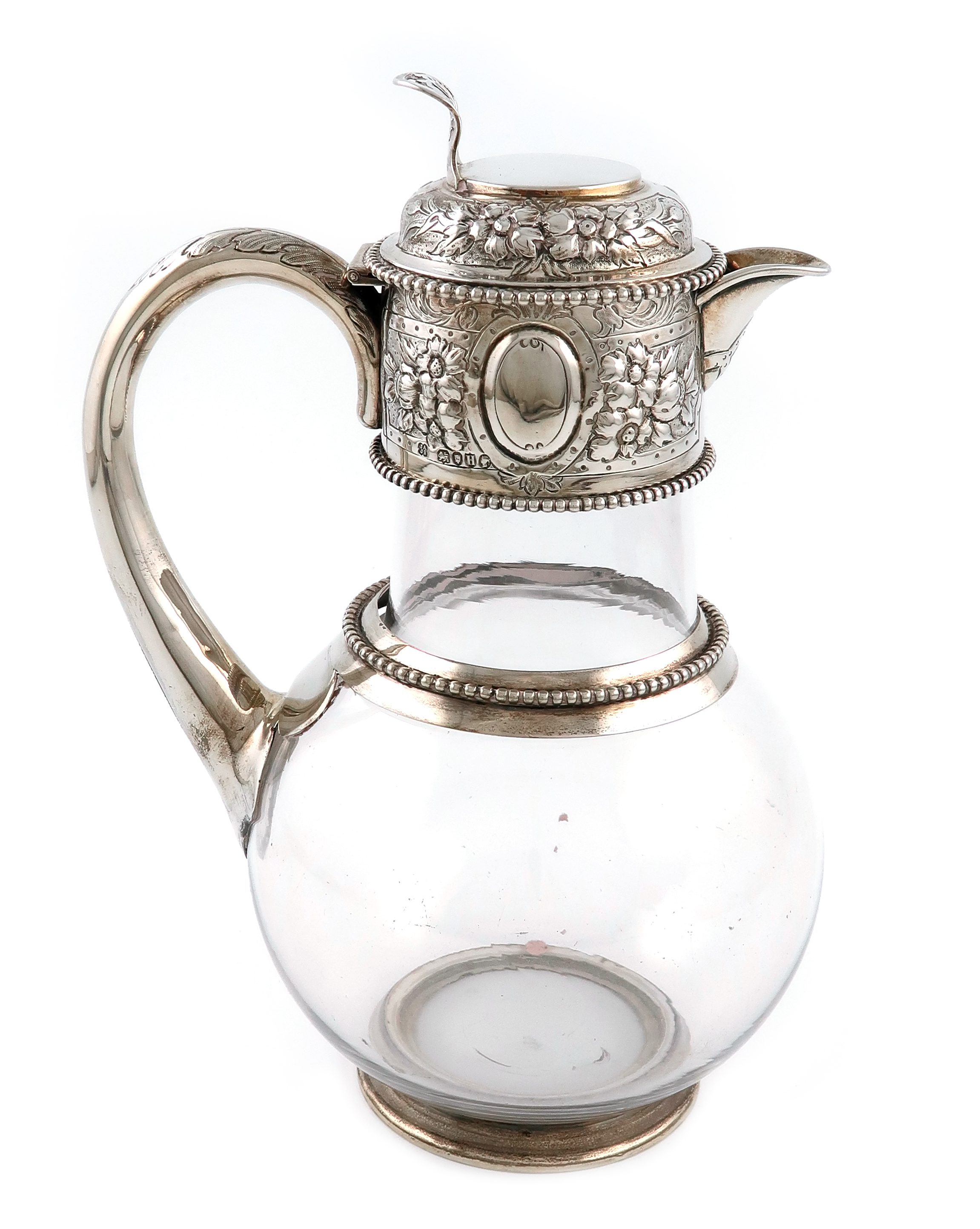 plain glass baluster body, the mounts with chased foliate decoration and beaded borders, the hinged cover with a pierced thumb-piece, the scroll handle fitted with a thermometer, (thermometer not working), height 24.3cm.