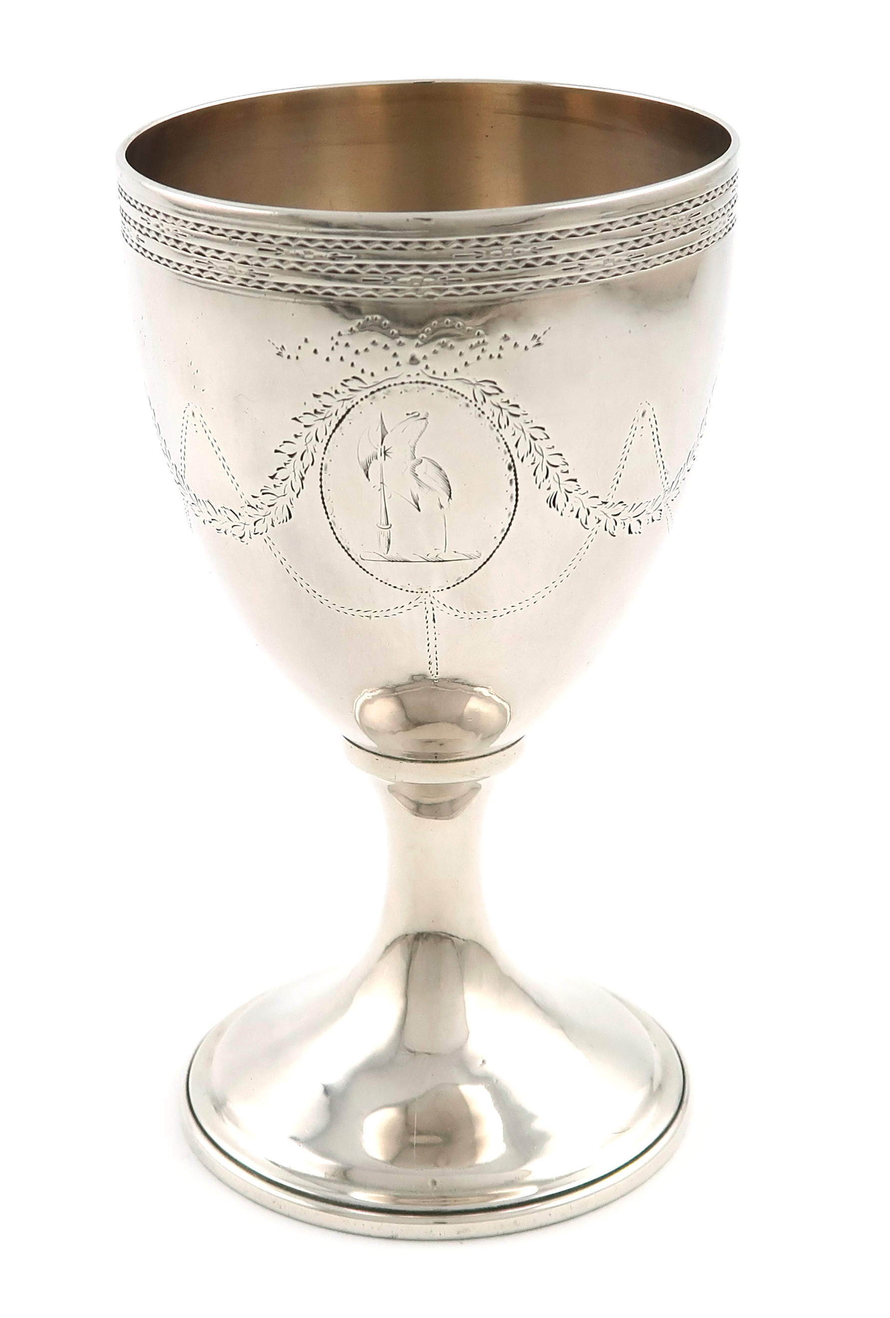 urn form, bright-cut borders and ribbon-tied foliate swags, with an oval cartouche with a crest, the reverse with initials, on a raised circular foot, height 14.5cm, approx. weight 5.8oz.