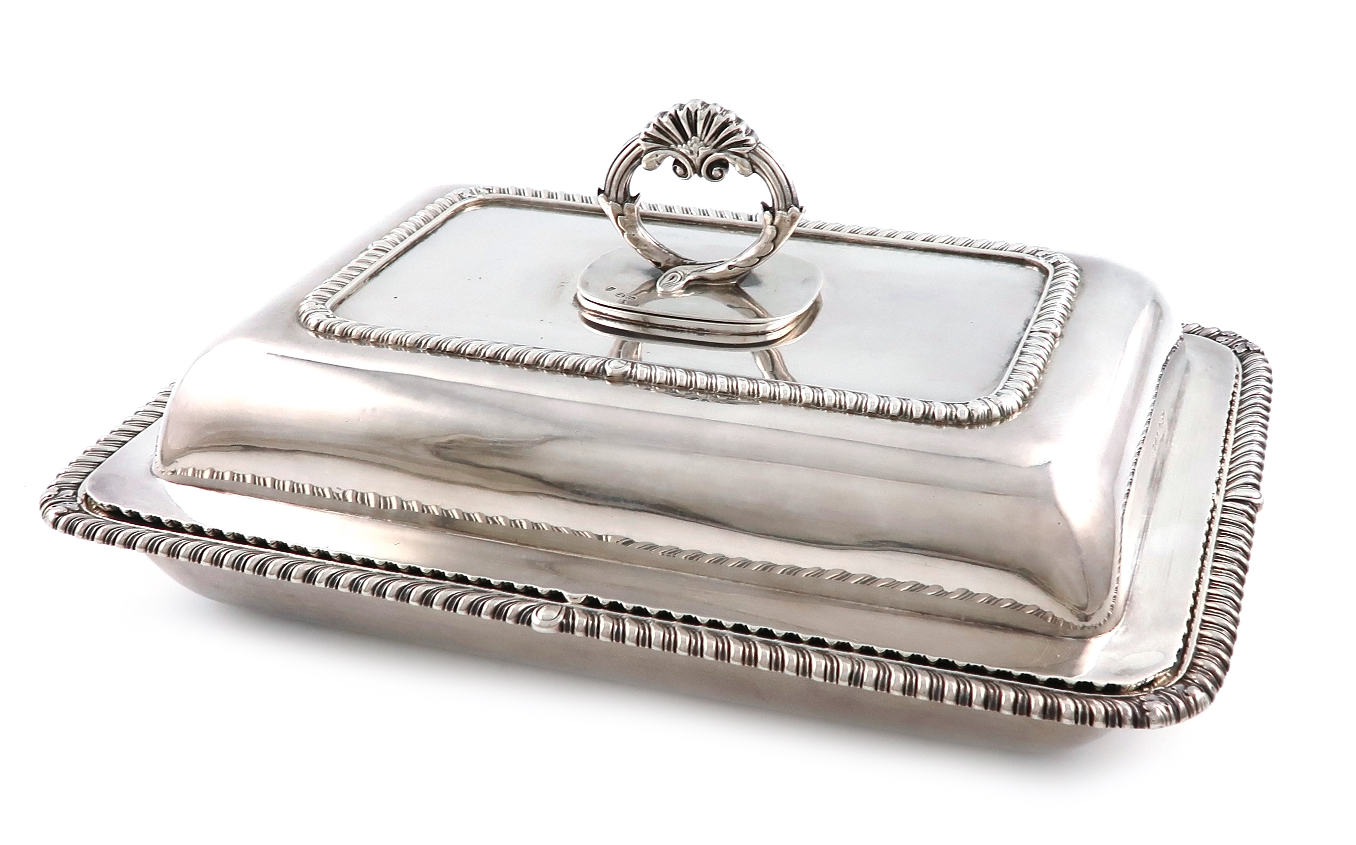 rectangular form, gadroon borders, the cover with a detachable fluted and shell handle, length 31cm, approx. weight 63.5oz.