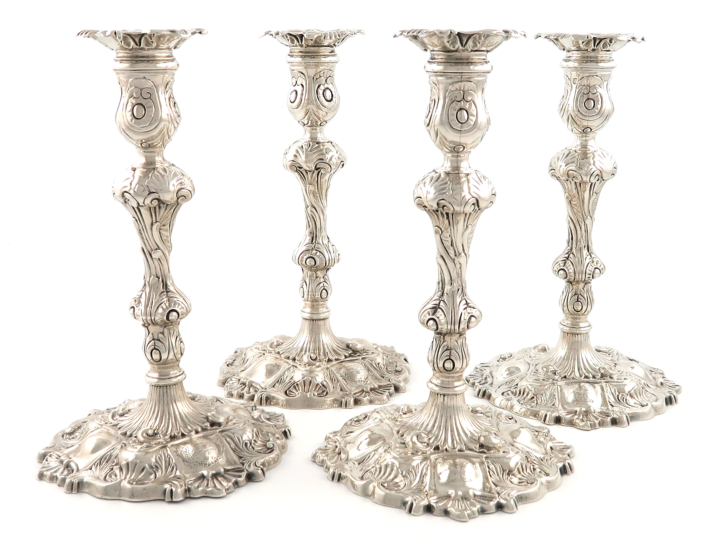 baluster columns, shell shoulders, urn shaped capitals, detachable unmarked drip pans, on spread circular bases with foliate and shell decoration, engraved with a crest and armorial, height 24.2cm, approx. weight 108oz. (4)