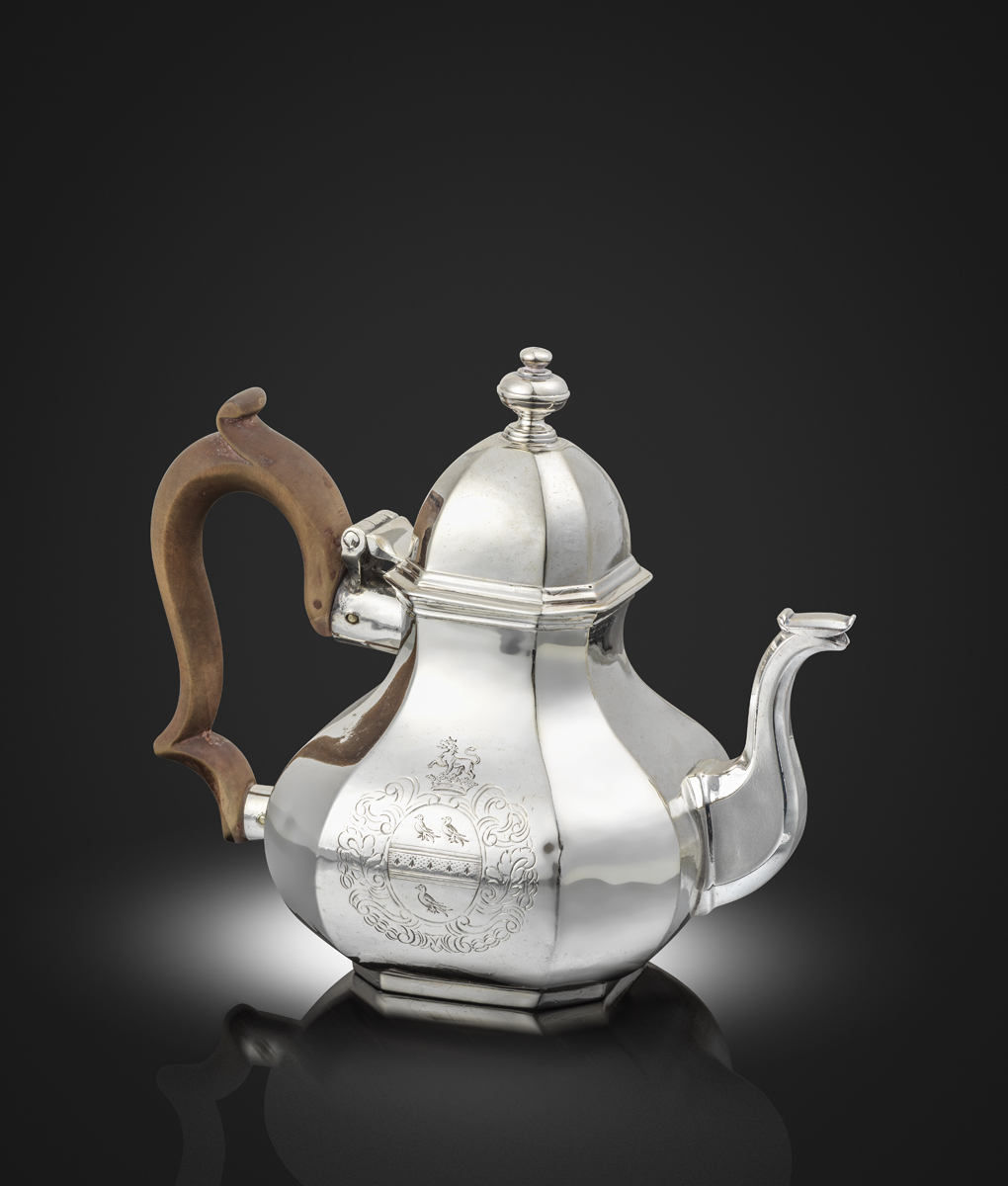 square pear from with canted corners, the raised hinged cover with a knop finial, scroll handle, engraved with an armorial within foliate scroll mantling, height 16cm, approx. weight 17oz.
