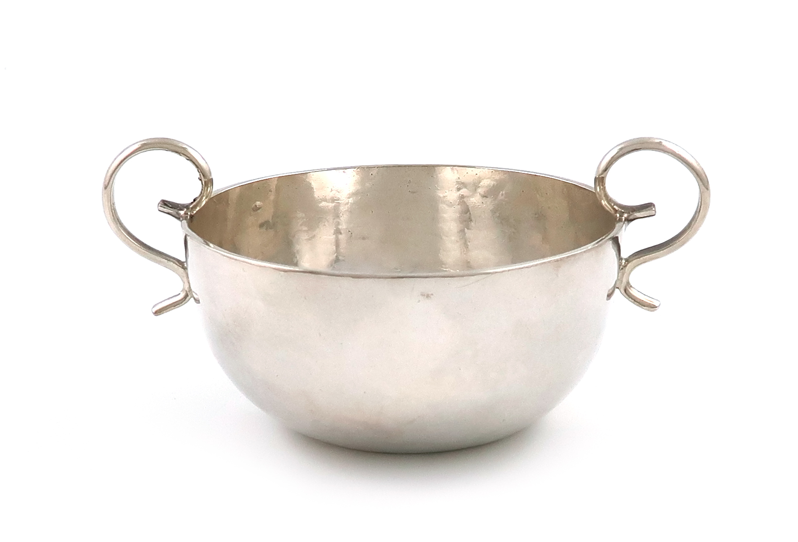 circular form, scroll handles, the underside scratch initialled 'P' over 'T*A', length handle to handle 11.5cm, approx. weight 2.9oz.