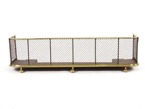 A Victorian brass fender, with iron mesh body on turned feet, 12.5in (32cm) h, 49.25in (125cm) w, 13.5in (34cm) d.