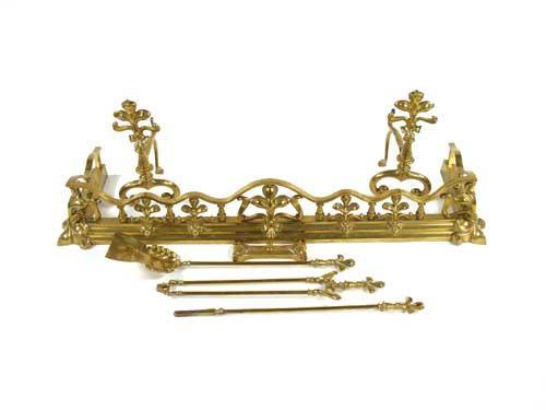 An Edwardian brass fireplace set in Neo classical style, the fender with husk draped urns and fir cone finials, 9.5in (24cm) h, 52in (132cm) w, 14in (35.5cm) d, with a pair of fire dogs the bases stamped with a monogram 'CSJ' and numbered, and a set of three fire tools. (5)
